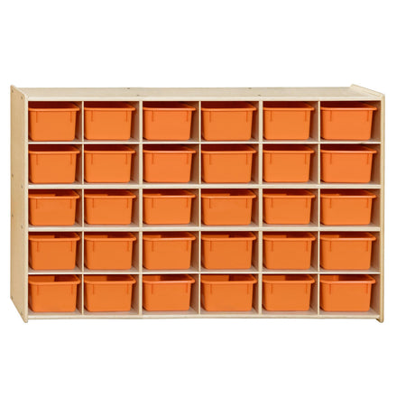 GREENGUARD Gold certified. (30) orange pastel cubby trays provide storage organization for small toys, knick-knacks, or supplies that may otherwise be misplaced. Birch Plywood, with mortise & secure fastener construction for exceptional strength and durability. Our exclusive UV Finish provides unsurpassed protection. Fully rounded corners and edges for maximum safety. 33-7/8"H x 50-3/4"W x 12"D. Fully assembled with casters available separately. Lifetime warranty. Made in the U.S.A.