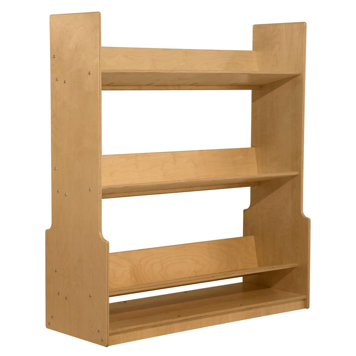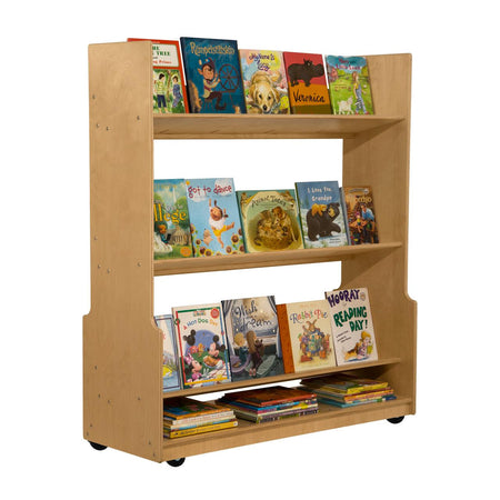 GREENGUARD® Gold certified. This book display cart features 3 angled shelves to display books with additional storage at the bottom. Constructed from birch plywood and coated with our exclusive Tuff-Gloss™ UV finish. Fully rounded corners and edges for maximum safety. 58"H x 48"W x 17 1/2"D. Ready to assemble. Lifetime warranty. Made in the U.S.A.