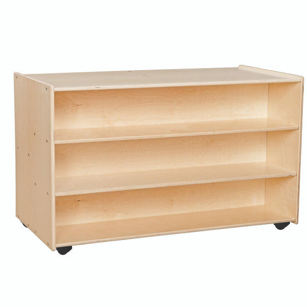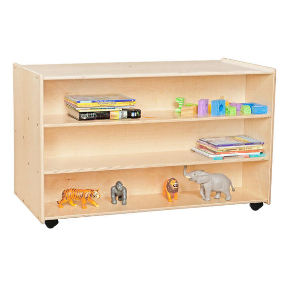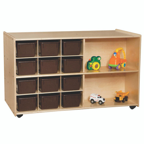 GREENGUARD Gold certified. Features generous storage on both sides and a top that can be utilized as a work space. (2) Large shelves and (12) cubbies with (12) brown cubby trays on one side and (3) full-length shelves on the other side provide organized storage. Birch Plywood, with mortise & secure fastener construction for exceptional strength and durability. Our exclusive UV Finish provides unsurpassed protection. Fully rounded corners and edges for maximum safety. 27-1/4"H x 46-3/4"W x 24"D. Ready to assemble with attachable casters. Lifetime warranty. Made in the U.S.A.