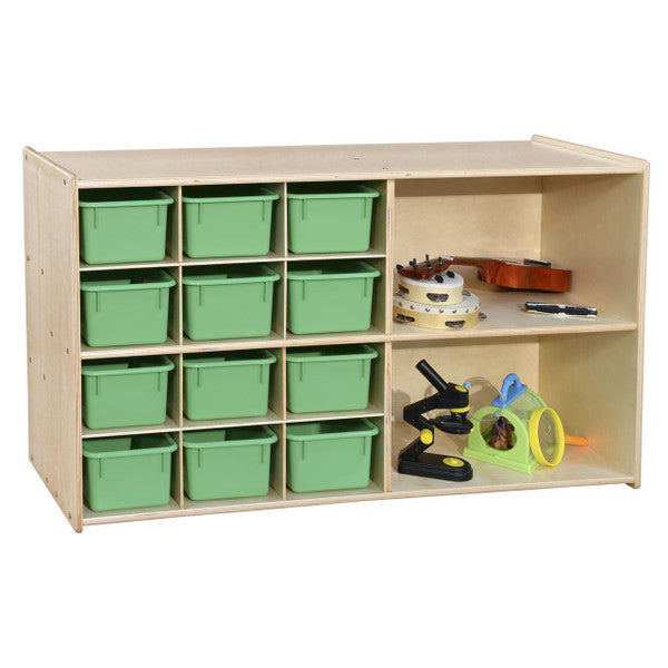 GREENGUARD Gold certified. Features generous storage on both sides and a top that can be utilized as a work space. (2) Large shelves and (12) cubbies with (12) lime green pastel cubby trays on one side and (3) full-length shelves on the other side provide organized storage. Birch Plywood, with mortise & secure fastener construction for exceptional strength and durability. Our exclusive UV Finish provides unsurpassed protection. Fully rounded corners and edges for maximum safety. 27-1/4"H x 46-3/4"W x 24"D. Ready to assemble with attachable casters. Lifetime warranty. Made in the U.S.A.