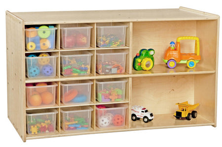 GREENGUARD Gold certified. Features generous storage on both sides and a top that can be utilized as a work space. (2) Large shelves and (12) cubbies with (12) translucent cubby trays on one side and (3) full-length shelves on the other side provide organized storage. Birch Plywood, with mortise & secure fastener construction for exceptional strength and durability. Our exclusive UV Finish provides unsurpassed protection. Fully rounded corners and edges for maximum safety. 27-1/4"H x 46-3/4"W x 24"D. Fully assembled on casters. Lifetime warranty. Made in the U.S.A.