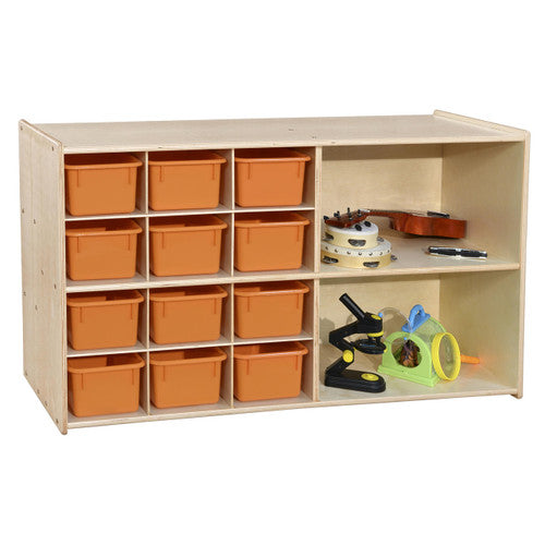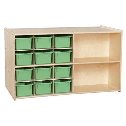 GREENGUARD Gold certified. Features generous storage on both sides and a top that can be utilized as a work space. (2) Large shelves and (12) cubbies on one side and (3) full-length shelves on the other side provide organized storage. Birch Plywood, with mortise & secure fastener construction for exceptional strength and durability. Our exclusive UV Finish provides unsurpassed protection. Fully rounded corners and edges for maximum safety. 27-1/4"H x 46-3/4"W x 24"D. Ready to assemble with attachable casters. Lifetime warranty. Made in the U.S.A.