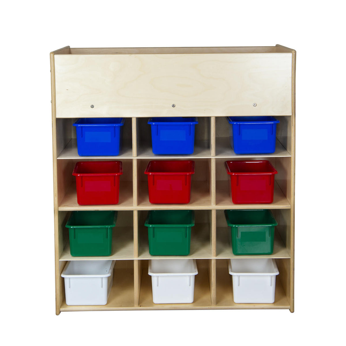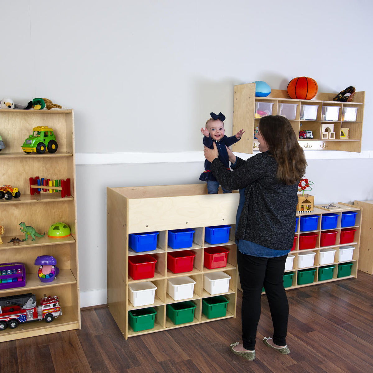 Change your baby’s diaper with this Contender Economy Diaper Changing Station with 12 Assorted Cubby Trays. This secure, durable and cost effective changing system helps adults safely take care of their children. Featuring a lipped changing station on top equipped with a red vinyl easy-to-clean changing pad. Below, there are twelve colorful cubby trays for all of your nursery storage needs. Constructed from Birch Plywood with eased edges and coated with our exclusive Tuff-Gloss™ UV finish making it resistant to stains and durable for any classroom or home settings. The mortise & steel fasteners provide exceptional joint strength and durability. Additionally, the recessed backing helps prevent tipping in a young educational environment. This product is GREENGUARD Gold certified for non-toxic emissions and air quality. The unit’s dimensions: 40”H x 36”W x 20”D. The tray dimensions: 5 1/4”H x 7 3/4”W x 11 ¼”D. This item comes fully assembled to your door step! The Contender Economy Diaper Changing Station with 12 Assorted Cubby Trays is proudly made in the U.S.A. with a lifetime warranty on the wooden frame.
