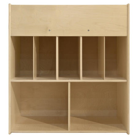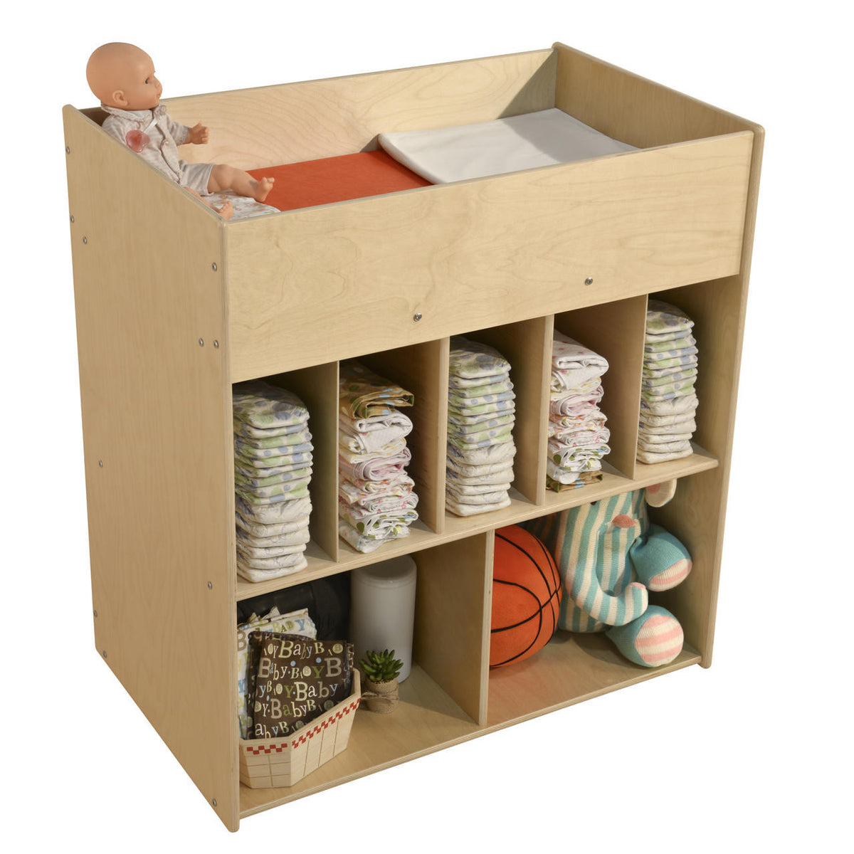 Change your baby’s diaper with this Contender Economy Diaper Changing Station with Shelves. This secure, durable and cost effective changing system helps adults safely take care of their children. Featuring a lipped changing station on top equipped with a red vinyl easy-to-clean changing pad. Below, there is an array of storage shelves for all of your nursery storage needs. Constructed from Birch Plywood with eased edges and coated with our exclusive Tuff-Gloss™ UV finish making it resistant to stains and durable for any classroom or home settings. The mortise & steel fasteners provide exceptional joint strength and durability. Additionally, the recessed backing helps prevent tipping in a young educational environment. This product is GREENGUARD Gold certified for non-toxic emissions and air quality. The unit’s dimensions: 43”H x 44”W x 20”D. The small shelf’s dimensions: 14 1/4”H x 6 5/8”W. The large shelf’s dimensions: 15 ¾”H x 17 7/16”W. This item comes flat packed and is ready to be assembled! The Contender Economy Diaper Changing Station with Shelves is proudly made in the U.S.A. with a lifetime warranty on the wooden frame.