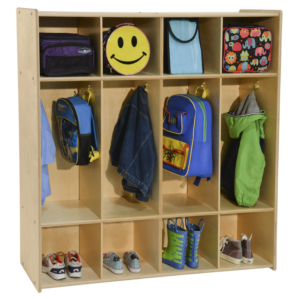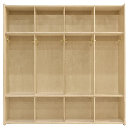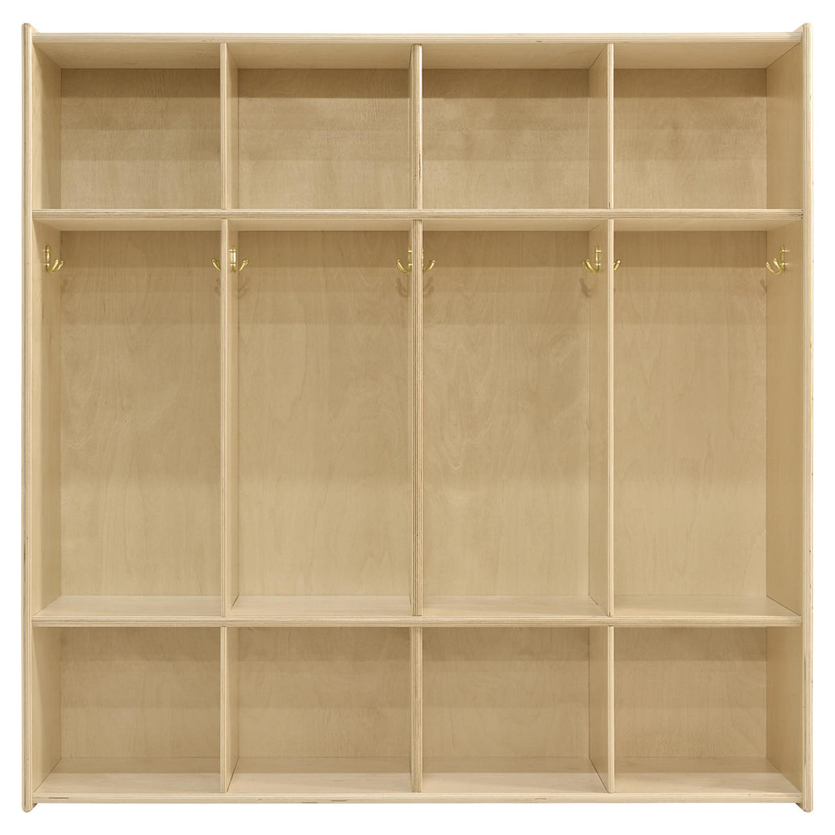 Greet and store your kid’s belongings in the morning with this Contender Four Section Locker. The locker is equipped with four kid-sized sections that features two double pronged locker hooks in the middle. Great for storing their backpacks, jackets or their favorite costumes! Additionally, there are two smaller cubbies above and below each section for their lunchboxes and shoes. The open layout provides easy access for their belongings and the natural finish is perfect for any classroom or home décor. Constructed from Birch Plywood with eased edges and coated with our exclusive Tuff-Gloss™ UV finish making it resistant to stains and durable for any active preschool or home settings. This product is GREENGUARD Gold certified for non-toxic emissions and air quality. The locker dimensions are 46 ¾”H x 46 ¾”W x 12”. The locker dimensions are 11”W x 25 5/8”H x 11”D. The cubby dimensions are 11”W x 8 ½”H x 11”D. The Contender Four Section Locker is proudly made in the U.S.A. with a lifetime warranty and comes fully assembled to your door step!