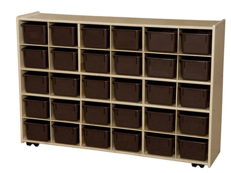 GREENGUARD Gold certified. (30) brown cubby trays provide storage organization for small toys, knick-knacks, or supplies that may otherwise be misplaced. Birch Plywood, with mortise & secure fastener construction for exceptional strength and durability. Our exclusive UV Finish provides unsurpassed protection. Fully rounded corners and edges for maximum safety. 35-7/8"H x 50-3/4"W x 12"D. Fully assembled on casters. Lifetime warranty. Made in the U.S.A.