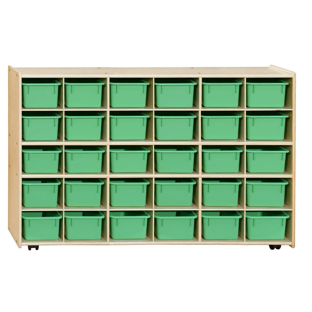 GREENGUARD Gold certified. (30) lime green pastel cubby trays provide storage organization for small toys, knick-knacks, or supplies that may otherwise be misplaced. Birch Plywood, with mortise & secure fastener construction for exceptional strength and durability. Our exclusive UV Finish provides unsurpassed protection. Fully rounded corners and edges for maximum safety. 35-7/8"H x 50-3/4"W x 12"D. Fully assembled on casters. Lifetime warranty. Made in the U.S.A.