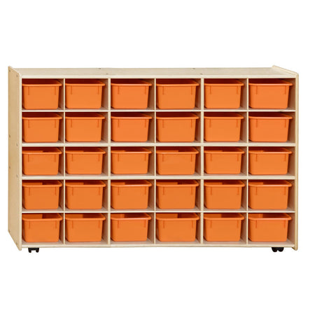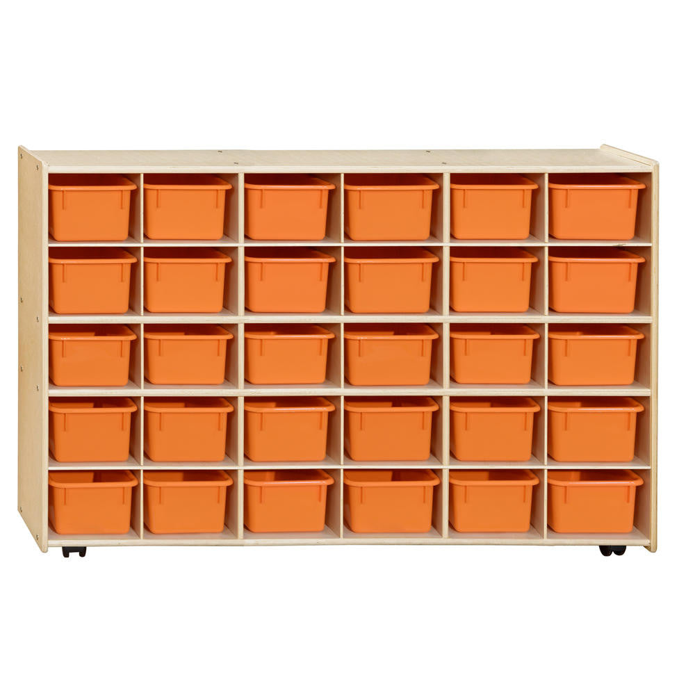 GREENGUARD Gold certified. (30) orange pastel cubby trays provide storage organization for small toys, knick-knacks, or supplies that may otherwise be misplaced. Birch Plywood, with mortise & secure fastener construction for exceptional strength and durability. Our exclusive UV Finish provides unsurpassed protection. Fully rounded corners and edges for maximum safety. 35-7/8"H x 50-3/4"W x 12"D. Fully assembled on casters. Lifetime warranty. Made in the U.S.A.