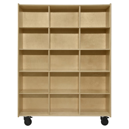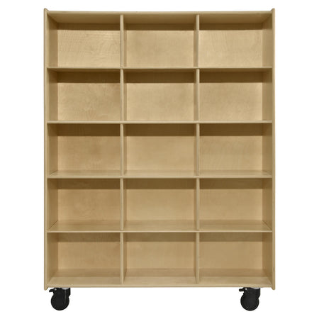 Organizing supplies for a large class? The Contender Mobile Big Twin Cubby Storage will be there for you. This large and durable double-sided storage cubby adds the versatility every teacher or parent needs. The fifteen large cubbies on either side provide an amazing amount of space for you and your kids. The four attached swiveling lockable casters make this hefty cubby glide and anchor conveniently around your room. Constructed from Birch Plywood with eased edges for safety and coated with our exclusive Tuff-Gloss™ UV finish makes this product resistant to stains and durable for any active classroom or home environments. This product is GREENGUARD Gold certified for non-toxic emissions and air quality with recessed. The total dimensions are 62 1/2”H x 48”W x 27”D. The cubby dimensions are 11”H x 15 1/8”W x 27”D. This item comes fully assembled to your door step! The Contender Mobile Big Twin Cubby Storage is proudly made in the U.S.A. with a lifetime warranty.