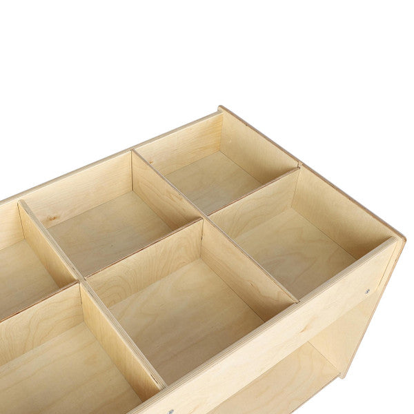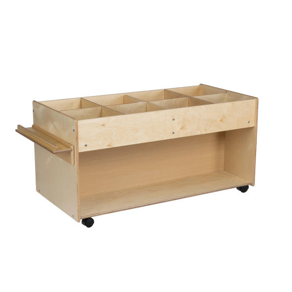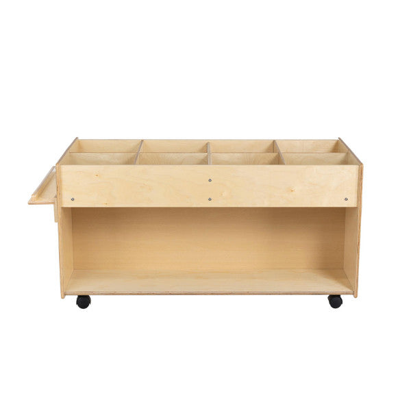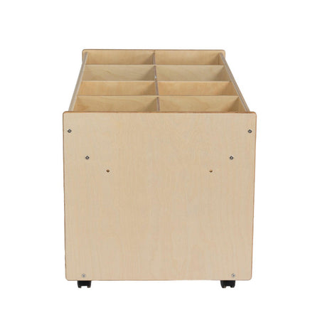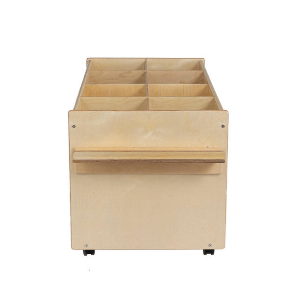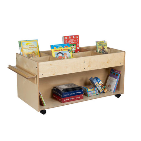 GREENGUARD Gold certified. This mobile book organizer has everything you need to keep your reading area tidy. (4) Upper and lower book organizer allows you to store more books with a smaller footprint. Birch Plywood, with mortise & secure fastener construction for exceptional strength and durability. Our exclusive UV Finish provides unsurpassed protection. Fully rounded corners and edges for maximum safety. 28-3/4"H x 46-3/4"W x 12"D. Ready to assemble with attachable casters. Lifetime warranty. Made in the U.S.A.