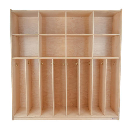 GREENGUARD Gold certified. Locker features eight divided hanging sections to meet stringent sanitation requirements. Side mounted coat hooks in each section accommodates coats and additional items. Eight generous cubby compartments above for school materials, boots, & more. Birch Plywood, with mortise & secure fastener construction for exceptional strength and durability. Our exclusive UV Finish provides unsurpassed protection. Fully rounded corners and edges for maximum safety. 49"H x 48"W x 12"D. Ready to assemble. Lifetime warranty. Made in the U.S.A.
