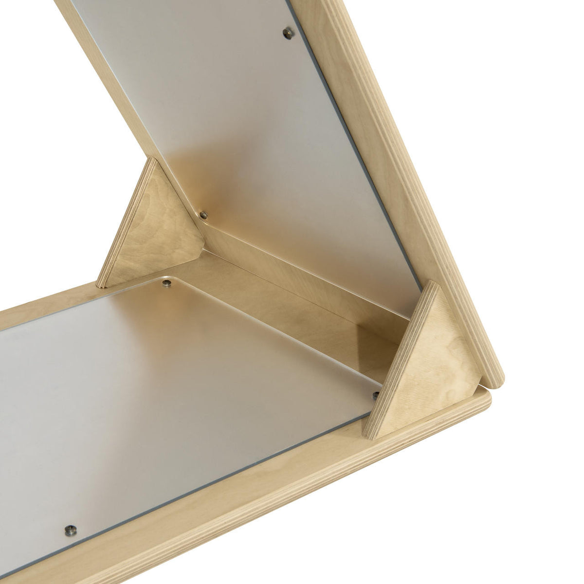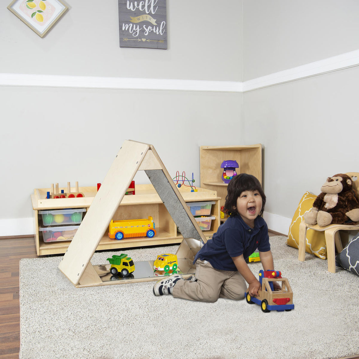 Explore sensory play in a safe new way with the Contender Sensory Triangle. This sturdy and safe (3) mirrored crawl space is designed to help create multiple reflections and different viewpoints for infants and toddlers. Sensory play is a natural way to encourage young children to use and hone their developing bodies. Constructed from Birch Plywood with eased edges and coated with our exclusive Tuff-Gloss™ UV Finish making it resistant to stains and durable for any early learning settings. The Unit Dimensions: 27”H x 29” W x 15”D. The Mirror Dimensions: 24” H x 11 ¾” W. This item comes flat packed and is ready to be assembled!