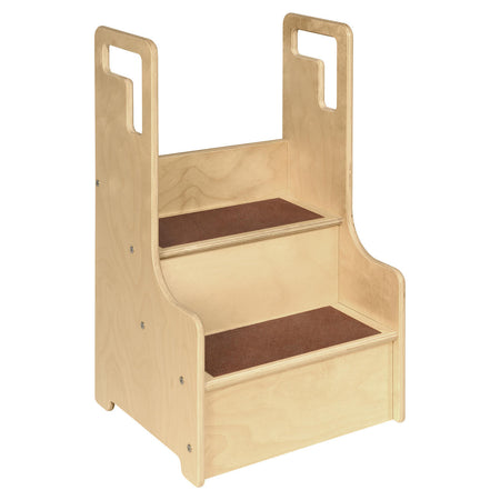 The Contender Step-Up-N-Wash- Brown is a sturdy and durable step stool that gives children a boost up providing early independence from an adult sized world. Featuring rounded hand rails on the side ensuring a safe climb up and slip resistant brown strips below on every step. Constructed from Birch Plywood with eased edges and coated with our exclusive Tuff-Gloss™ UV finish making it resistant to stains and durable for any active classroom or home settings. This product is GREENGUARD Gold certified for non-toxic emissions and air quality. The stool’s dimensions are 18"w x 28"h x 15"d. The top step is 14" off the ground and each step is 7" deep. The Contender Step-Up-N-Wash- Brown is proudly made in the U.S.A. with a lifetime warranty and comes fully assembled to your door step!