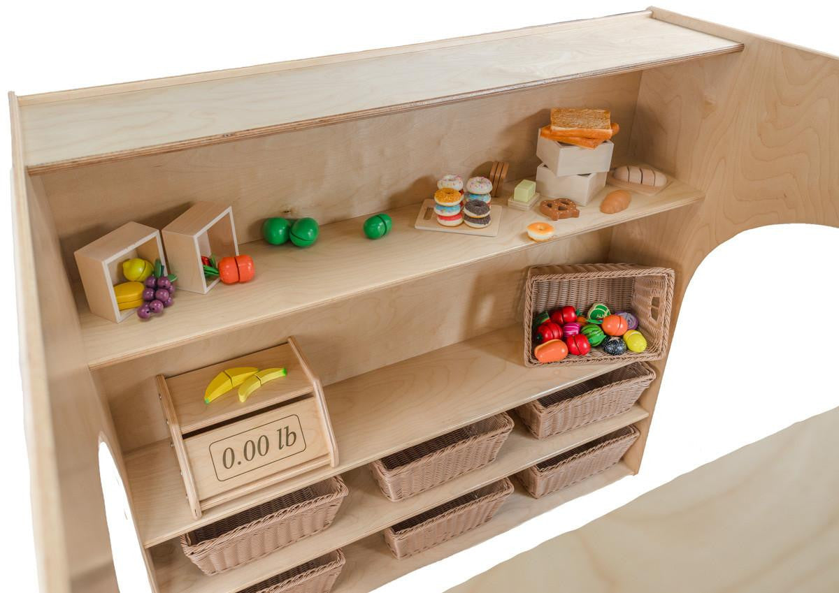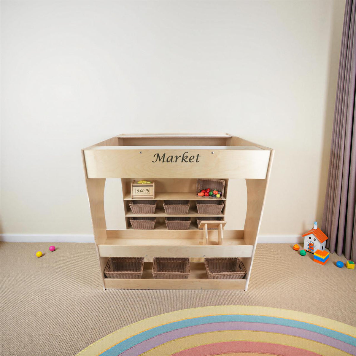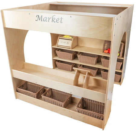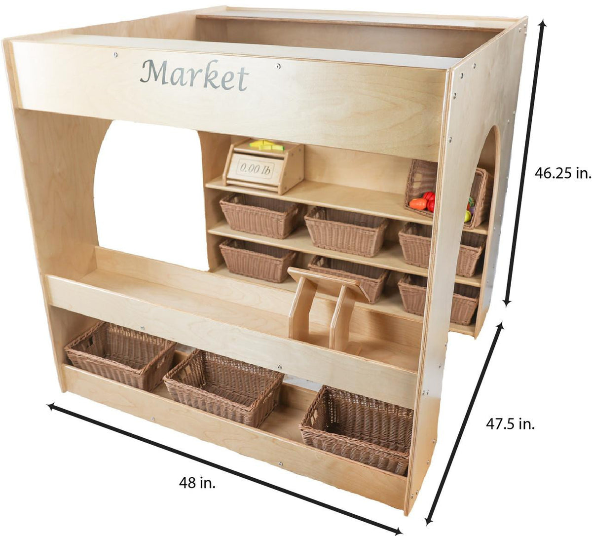 Young children love to mimic the real-world scenarios by pretending to run a market and go shopping. This market set features a pretend cash register and scale, a countertop, with shelving below, (10) wicker baskets for storage, and shelving behind.
