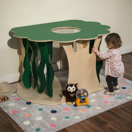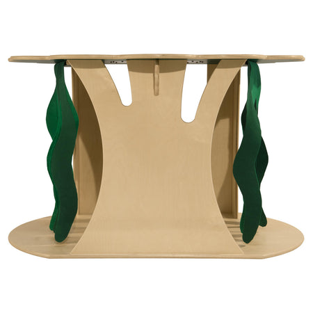 The Contender Tree Hideaway is a fun small, covered reading or exploration space for young learners. This jungle or forest themed sensory-safe literacy nook is designed to give young children a spot in your home or classroom where they can feel safe from sensory overload, while maintaining proper visibility on ages 2 and up. Featuring a large 14” diameter plastic ceiling cutout that mimics a tree canopy and allows additional light to reach inside. Additionally, along the sides are alternating felt vines to help create a cozier space. Constructed from heavy-duty Birch Plywood with rounded edges for child safety, GREENGUARD Gold certified for non-toxic emissions and air quality, and triple coated with our exclusive UV Tuff-Gloss™ finish making it easy to clean and resistant to stains, providing the durability to withstand any high traffic classrooms or home settings. The Tree Hideaway’s total dimensions are 29 1/16”H x 48” W x 39” D. The Tree Hideaway comes flat packed and is ready to be assembled. The Contender Tree Hideaway is proudly made in the U.S.A. with a Lifetime Manufacturer’s Warranty on the wooden frame.