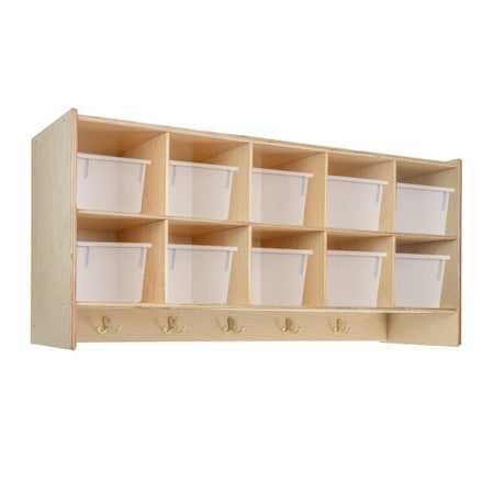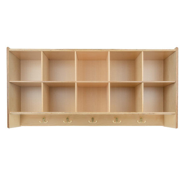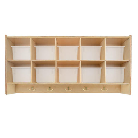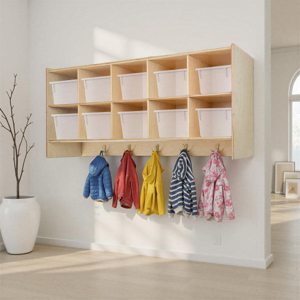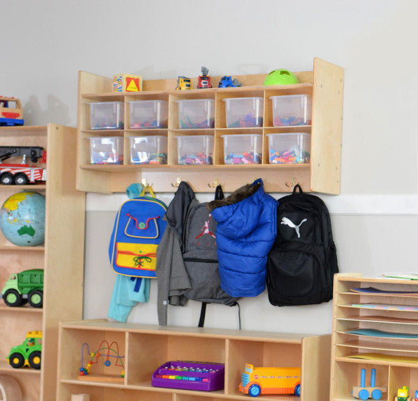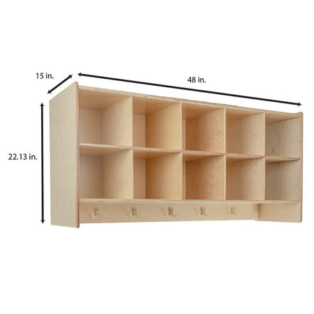 GREENGUARD Gold certified. An excellent combination of storage shelves and (5) double coat hooks in a wall mountable unit. Includes (10) translucent cubby trays. Birch Plywood, with mortise & secure fastener construction for exceptional strength and durability. Our exclusive UV Finish provides unsurpassed protection. Fully rounded corners and edges for maximum safety. 21-3/4"H x 46-3/4"W x 12"D. Ready to assemble. Lifetime warranty. Made in the U.S.A.