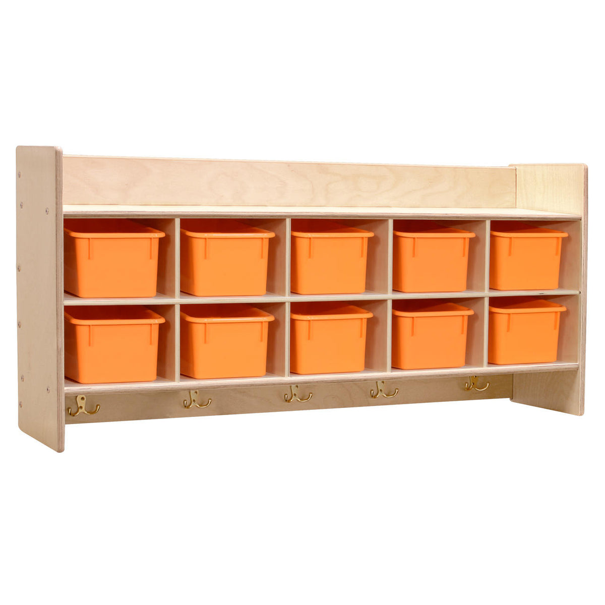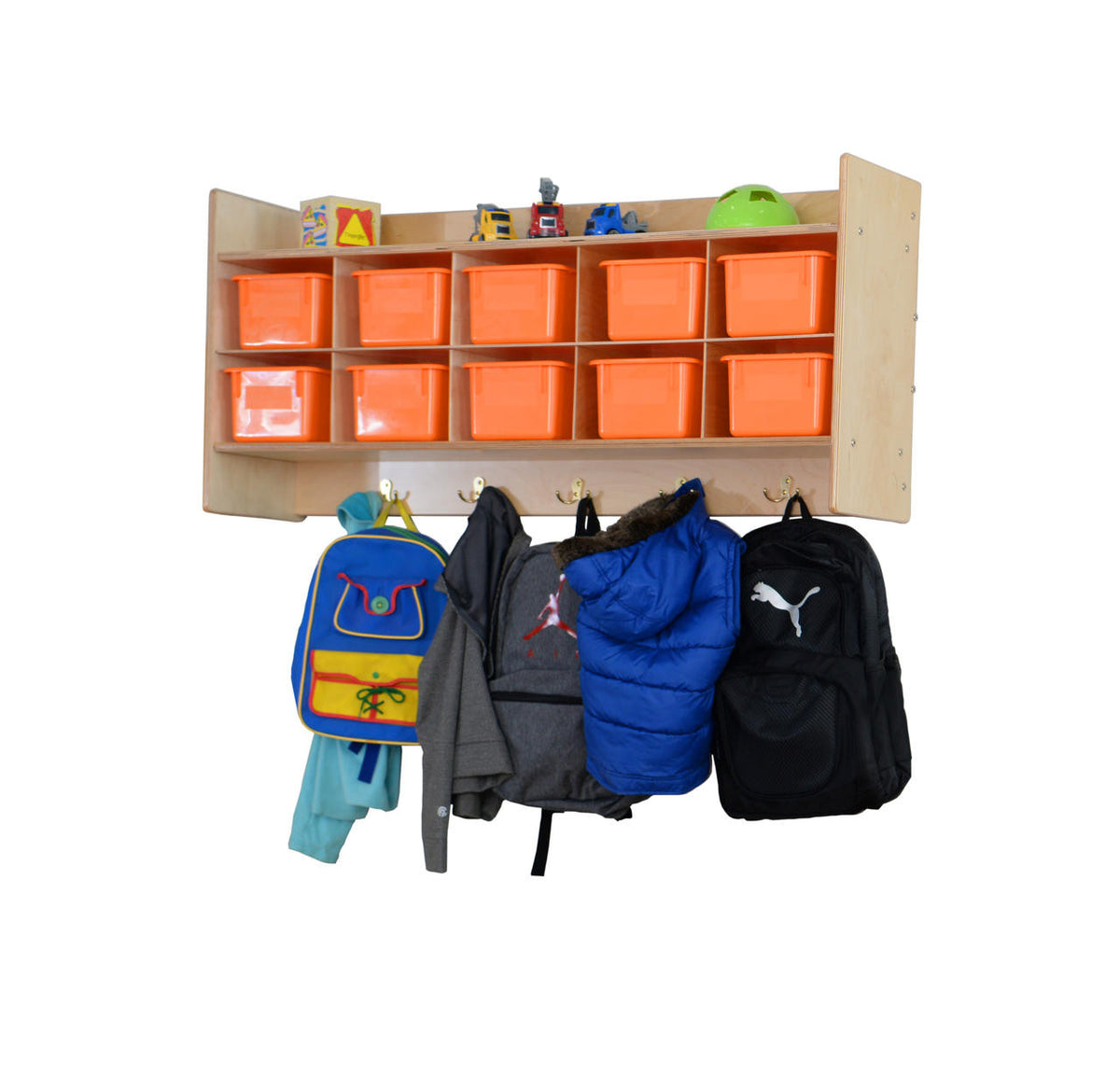 GREENGUARD Gold certified. An excellent combination of storage shelves and (5) double coat hooks in a wall mountable unit. Includes (10) orange pastel cubby trays. Birch Plywood, with mortise & secure fastener construction for exceptional strength and durability. Our exclusive UV Finish provides unsurpassed protection. Fully rounded corners and edges for maximum safety. 21-3/4"H x 46-3/4"W x 12"D. Fully assembled. Lifetime warranty. Made in the U.S.A.