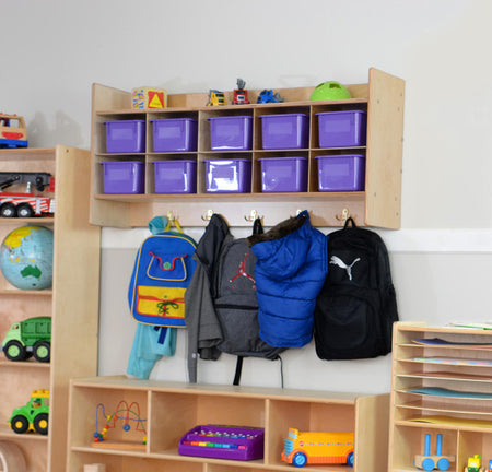 GREENGUARD Gold certified. An excellent combination of storage shelves and (5) double coat hooks in a wall mountable unit. Includes (10) purple pastel cubby trays. Birch Plywood, with mortise & secure fastener construction for exceptional strength and durability. Our exclusive UV Finish provides unsurpassed protection. Fully rounded corners and edges for maximum safety. 21-3/4"H x 46-3/4"W x 12"D. Fully assembled. Lifetime warranty. Made in the U.S.A.