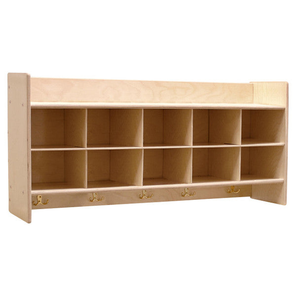 GREENGUARD Gold certified. An excellent combination of storage shelves and (5) double coat hooks in a wall mountable unit. Birch Plywood, with mortise & secure fastener construction for exceptional strength and durability. Our exclusive UV Finish provides unsurpassed protection. Fully rounded corners and edges for maximum safety. 21-3/4"H x 46-3/4"W x 12"D. Fully assembled. Lifetime warranty. Made in the U.S.A.