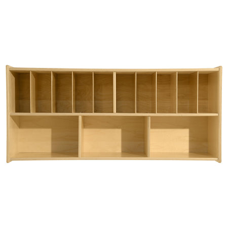 Easily create extra storage space for your room with this Contender Wall Mountable Diaper Storage. This station has 10 small storage slots perfect for diapers and nappies. Below, there are three larger cubbies great for bottles, powder and other supplies. Constructed from Birch Plywood with eased edges and coated with our exclusive Tuff-Gloss™ UV finish making it resistant to stains and durable for any classroom or home settings. The mortise & steel fasteners provide exceptional joint strength and durability. This product is GREENGUARD Gold certified for non-toxic emissions and air quality. The unit’s dimensions: 21 1/4”H x 46 3/4”W x 12”D. The unit’s is weight: 49lbs. The small cubbies dimensions: 9 3/16”H x 4 3/8”W. The large cubbies dimensions: 9 3/16”H x 14 3/4”W. This item comes flat packed and is ready to be assembled! This unit does not come with mounting hardware. The Contender Wall Mountable Diaper Storage is proudly made in the U.S.A. with a lifetime warranty.
