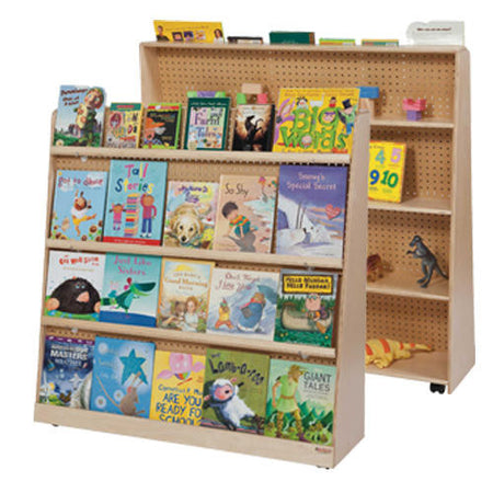 GREENGUARD Gold certified. The (2)-sided design of this deluxe book display offers extra storage, while (3) adjustable shelves provide versatility. Constructed from Birch Plywood, and coated with our exclusive Tuff-Gloss™ UV finish. Fully rounded corners and edges for maximum safety. 50”H x 48”W x 18”D. Fully assembled on locking casters. Lifetime warranty.