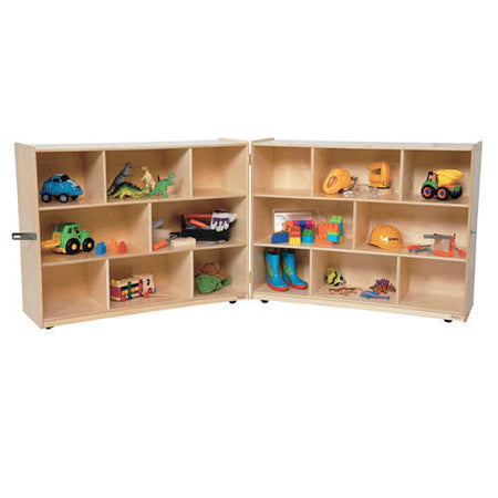 GREENGUARD Gold certified. (2) hinged WD14218 storage units can be folded & secured with locking hasp to safeguard contents. Constructed from Birch Plywood, and coated with our exclusive Tuff-Gloss™ UV finish. Recessed backs for added strength, stability, and beauty. Fully rounded corners and edges for maximum safety. Folds to 48"W x 36"D. Opens to 43-5/8"H x 96"W x 18"D. Units are fully assembled on locking casters. Simple hinge pin connection required. Lifetime warranty. Made in the U.S.A.