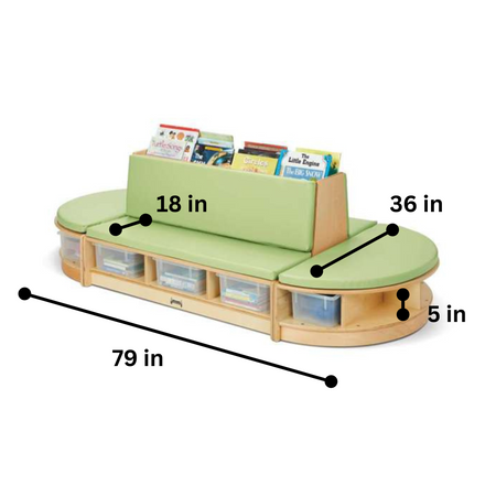 Provide youngsters with a comfortable nook to expand their reading proficiency while building their social skills. Includes a double sided couch with slots for ample book storage and two semi-circle benches to form a beautiful and practical literacy center. Comfortable key lime cushions provide a pop of color and are easy to clean. Seat height is 11 inches. Cushions, six tubs, and four cubbie-trays included. Product Dimension : 79" width X23.5" Height X 36" Depth Made in USA, Life Time Warranty