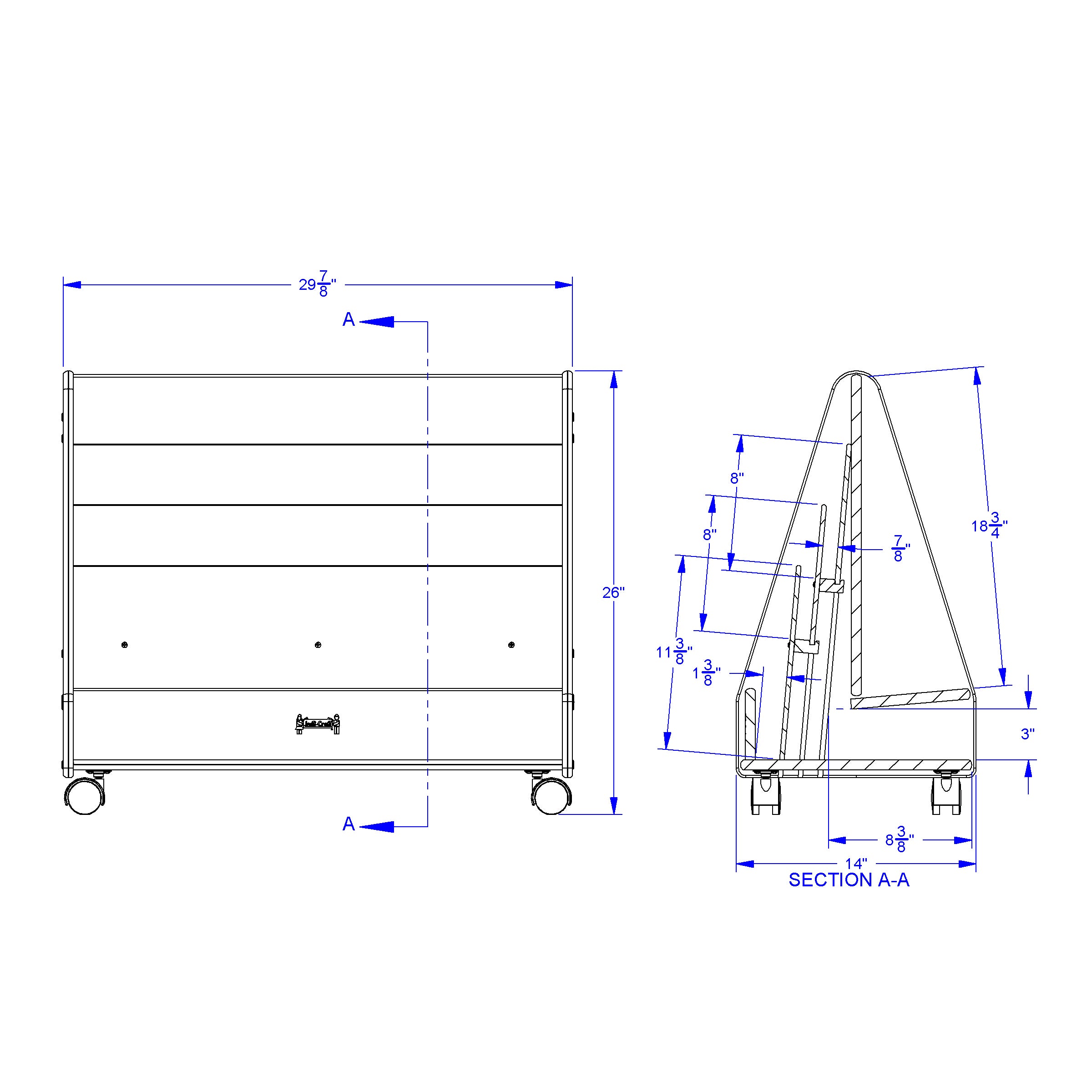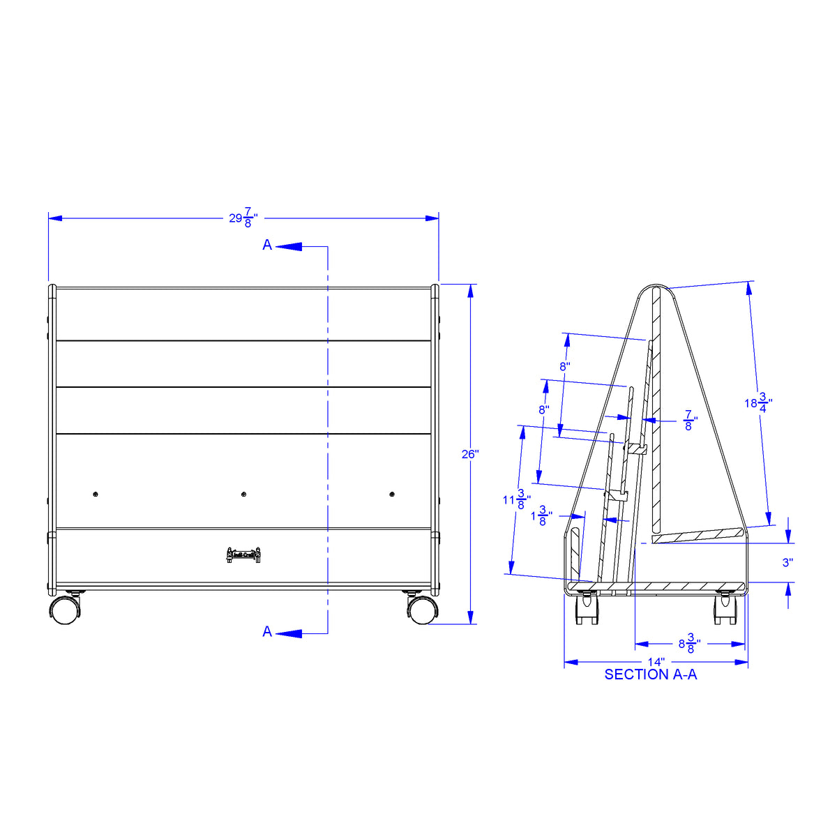 Three book shelves at pre-school height. Each shelf is approximately 1" deep. Storage and display space in back. Paper-trays sold separately. Product Dimension : 30" width X26" Height X 14" Depth Made in USA, Life Time Warranty