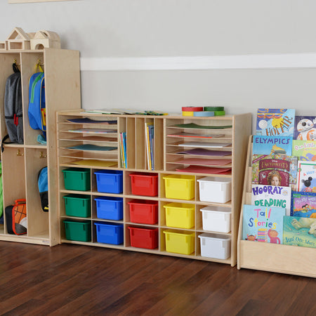 GREENGUARD Gold certified. Versatile divided storage areas for puzzles, games, and books. Plus a generous storage area for (15) assorted pastel cubby trays. Constructed from Birch Plywood, and coated with our exclusive Tuff-Gloss™ UV finish. A recessed back for added strength, stability, and beauty. Fully rounded corners and edges for maximum safety. 38"H x 48"W x 15"D. Fully assembled on locking casters. Lifetime warranty. Made in the U.S.A.