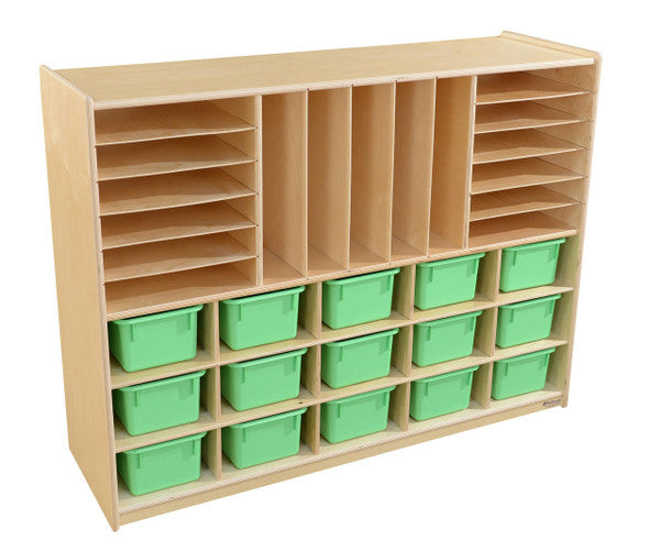 GREENGUARD Gold certified. Versatile divided storage areas for puzzles, games, and books. Plus a generous storage area for (15) lime green pastel cubby trays. Constructed from Birch Plywood, and coated with our exclusive Tuff-Gloss™ UV finish. A recessed back for added strength, stability, and beauty. Fully rounded corners and edges for maximum safety. 38"H x 48"W x 15"D. Fully assembled on locking casters. Lifetime warranty. Made in the U.S.A.
