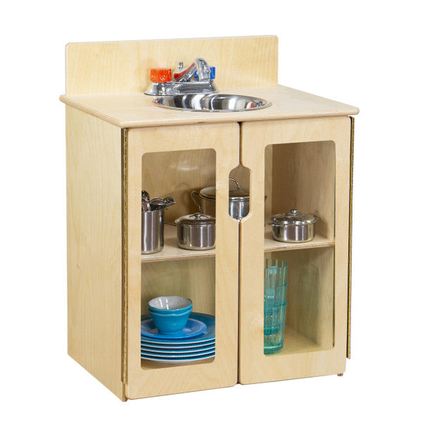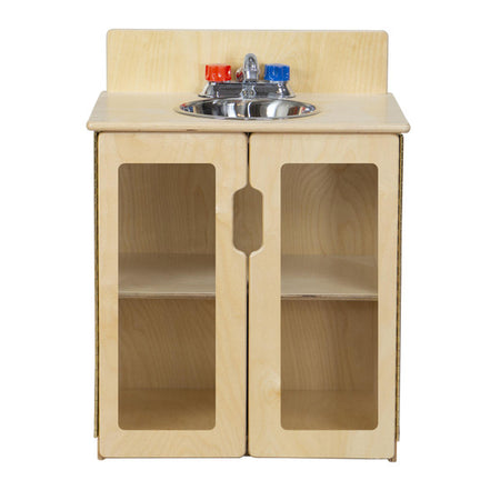 GREENGUARD Gold Certified. The My Cottage sink combines an innovative new realistic silver faucet with movable plastic knobs, and a durable plastic sink pan. Constructed from Birch Plywood, with our exclusive Tuff-Gloss™ UV finish. Fully rounded corners and edges for maximum safety. A recessed back for added strength, stability, and beauty. Full length Pinch-Me-Not™™ hinges with full length Tip-Me-Not™ doors with acrylic panels to create polished and comfotable style. Fully rounded corners, edges, and doors for maximum safety. 22-9/16"H x 20-1/2"W x 15"D. Lifetime Warranty. Fully Assembled. Made in the U.S.A.