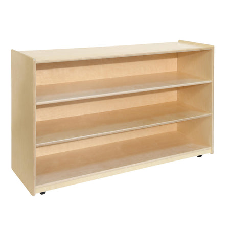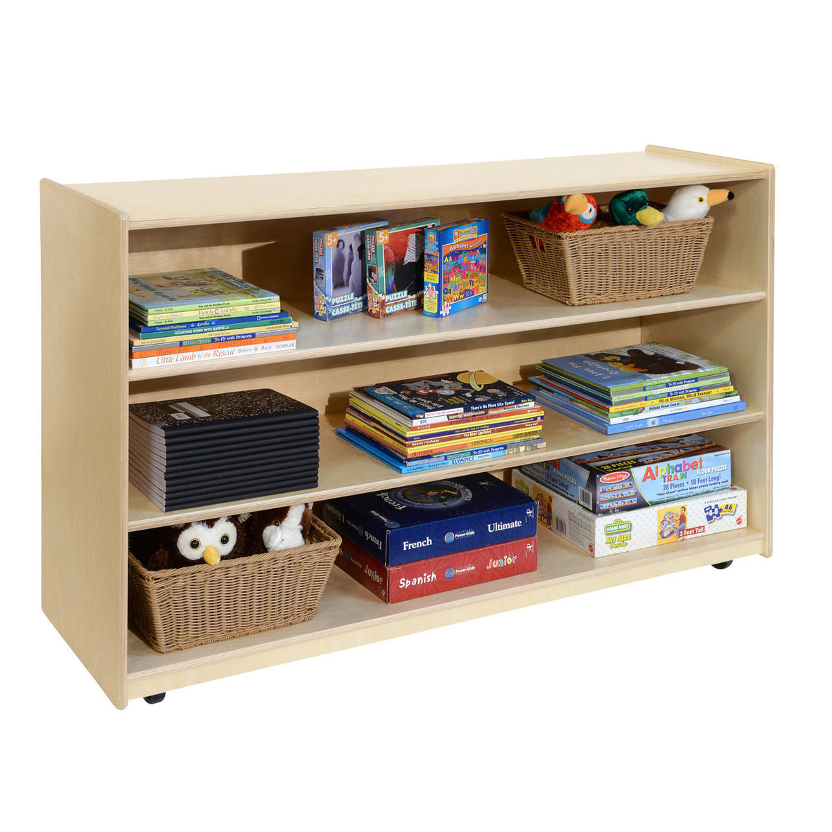GREENGUARD Gold certified. Attractive bookshelf provides versatility in every room. (3) fixed shelves to provide plenty of space for books, puzzles, and more. Constructed from Birch Plywood and coated with our exclusive Tuff-Gloss™ UV finish. A recessed back for added strength, stability, and beauty. Fully rounded corners and edges for total safety. 38"H x 48"W x 15"D. Fully assembled on locking casters. Lifetime warranty. Made in the U.S.A.