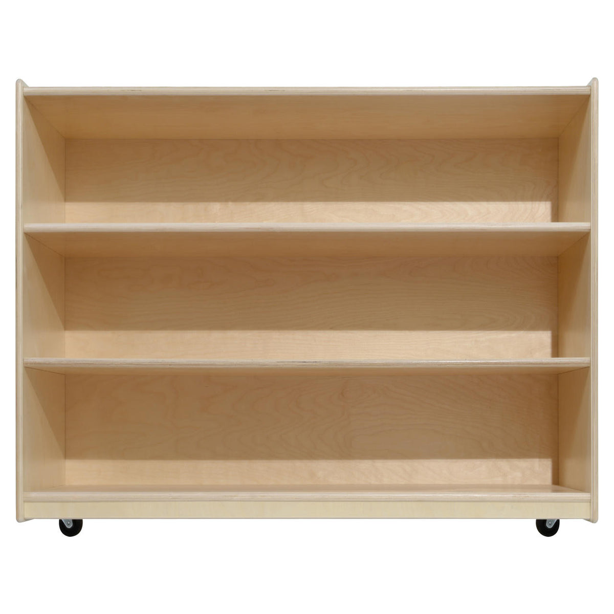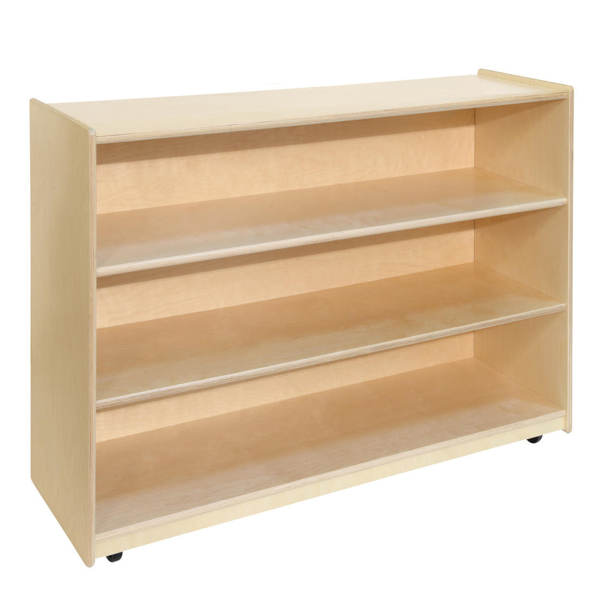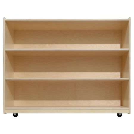 GREENGUARD Gold certified. Attractive bookshelf provides versatility in every room. (3) fixed shelves to provide plenty of space for books, puzzles, and more. Constructed from Birch Plywood and coated with our exclusive Tuff-Gloss™ UV finish. A recessed back for added strength, stability, and beauty. Fully rounded corners and edges for total safety. 43-5/8"H x 48"W x 15"D. Fully assembled on locking casters. Lifetime warranty. Made in the U.S.A.
