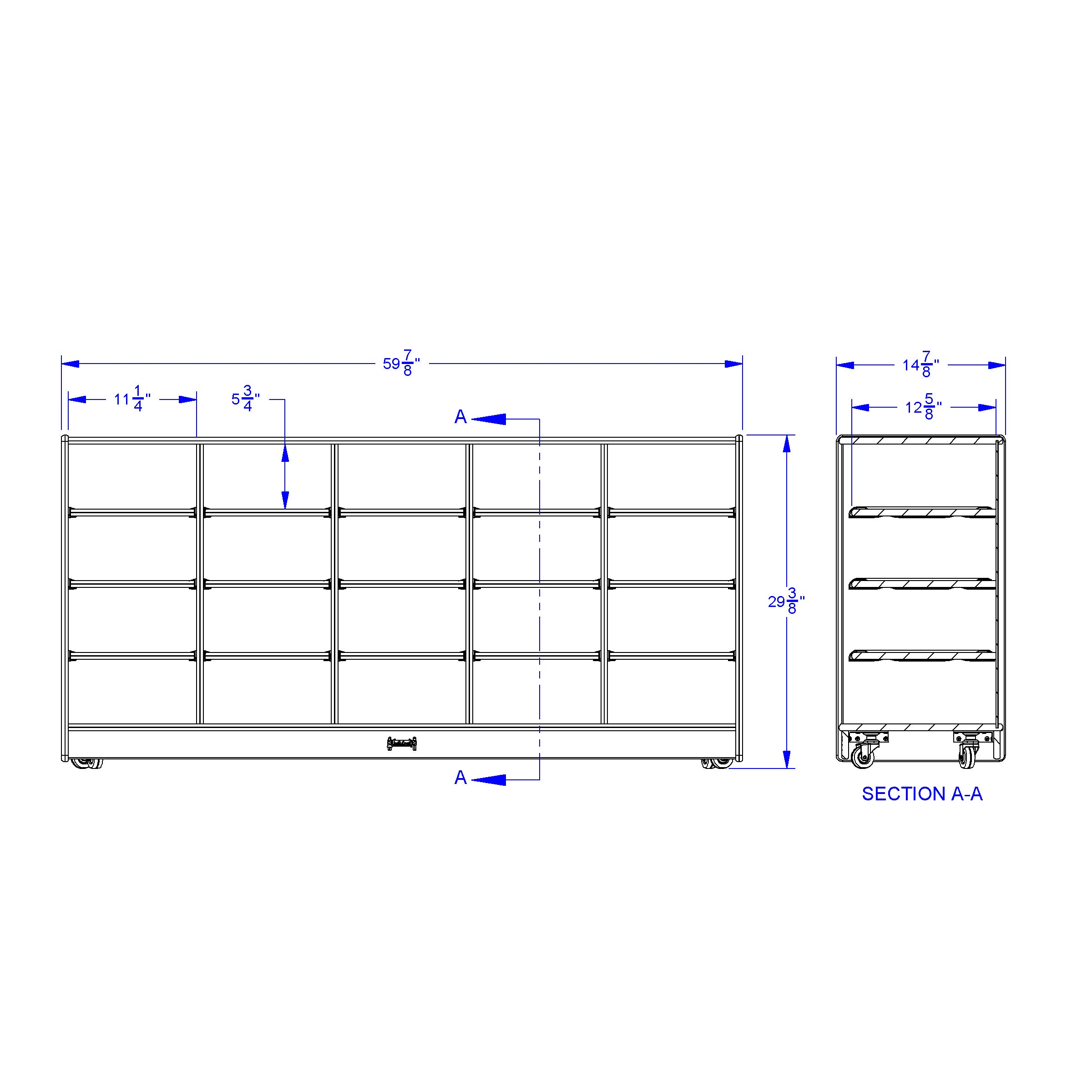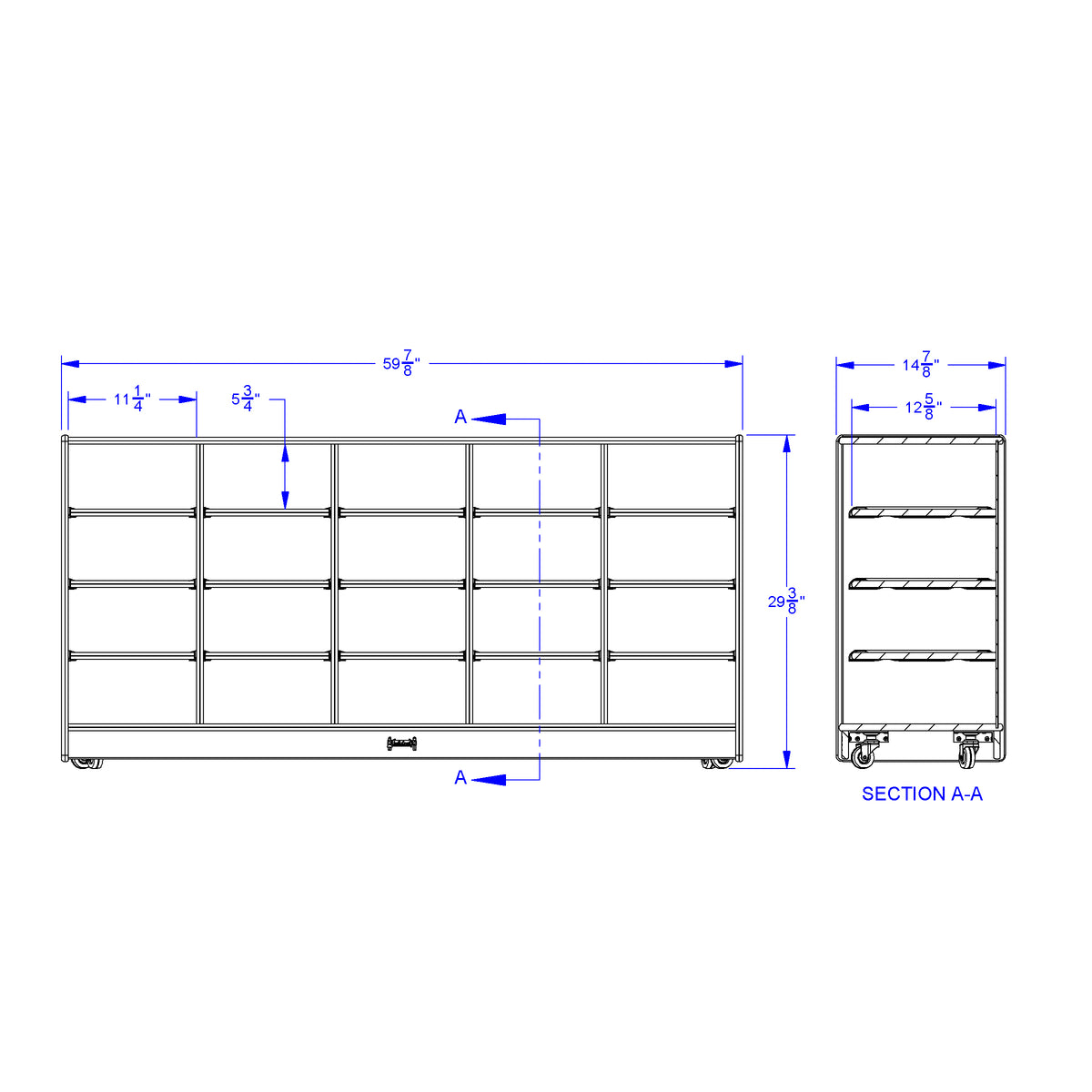 Provide a storage space for 20 students or store classroom supplies with this 20 Tub opening storage unit. Papers (8.5" x 11") lay flat, without curled edges, in open sections sized perfectly for Tubs. Tubs not included. Constructed of double-sided freckled gray laminate with purple TRUEdge. Product Dimension : 60" width X29.5" Height X 15" Depth Made in USA, Life Time Warranty