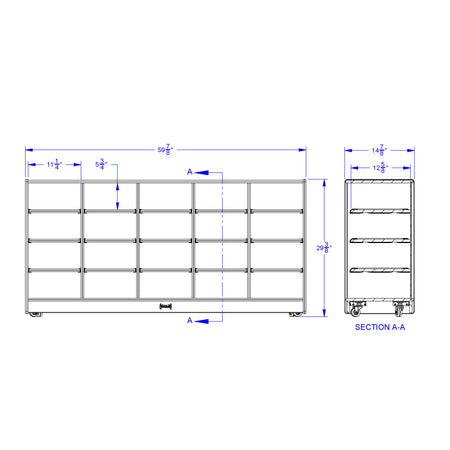 Provide a storage space for 20 students or store classroom supplies with this 20 Tub opening storage unit. Papers (8.5" x 11") lay flat, without curled edges, in open sections sized perfectly for Tubs. Tubs not included. Constructed of double-sided freckled gray laminate with teal TRUEdge. Product Dimension : 60" width X29.5" Height X 15" Depth Made in USA, Life Time Warranty