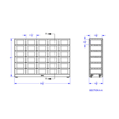 Tons of storage for individual students or classroom supplies with this mobile unit! Papers (8.5" x 11") lay flat, without curled edges, inside the included 30 Tubs. Constructed of double-sided freckled gray laminate with blue TRUEdge. Product Dimension : 60" width X42" Height X 15" Depth Made in USA, Life Time Warranty
