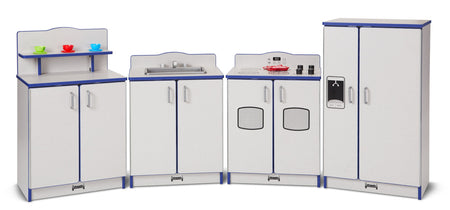 Inspire budding chefs to prepare gourmet meals with this kitchen. Each unit features an interior shelf for storing play food and dishes. Magnetic catches help keep doors closed while chrome-looking handles and faucet provide a high-end aesthetic. Realistic play with wooden turn-button