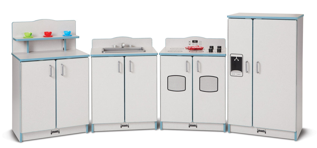 Inspire budding chefs to prepare gourmet meals with this kitchen. Each unit features an interior shelf for storing play food and dishes. Magnetic catches help keep doors closed while chrome-looking handles and faucet provide a high-end aesthetic. Realistic play with wooden turn-button
