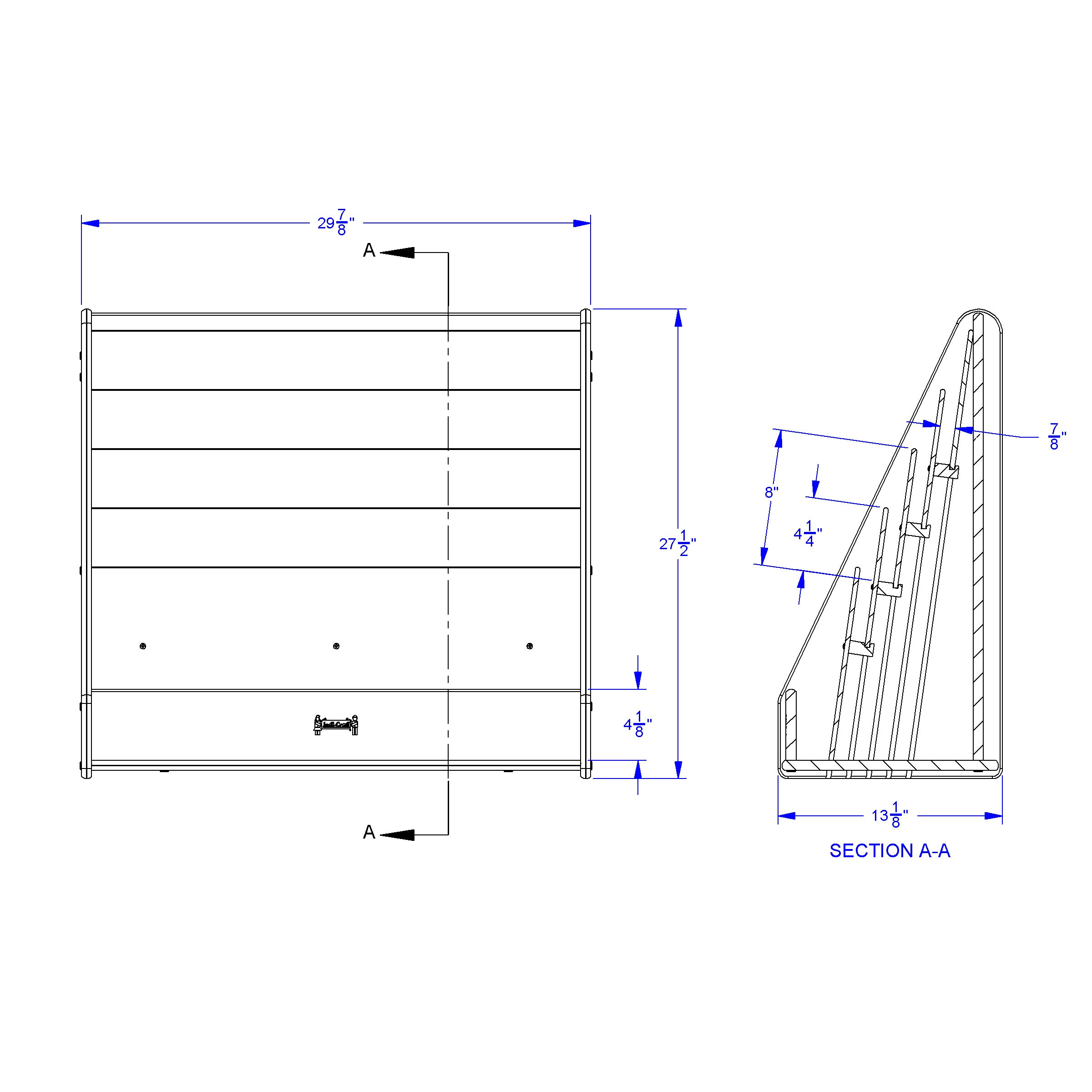 This flushback book stand is perfect for placing against a wall or using the write-n-wipe back for multipurpose use. Features five display shelves with approximately 1" shelf depth. The bookstand stores flush against walls and the top is fully rounded. Constructed of double-sided freckled gray laminate with navy TRUEdge. Product Dimension : 30" width X27.5" Height X 13.5" Depth Made in USA, Life Time Warranty