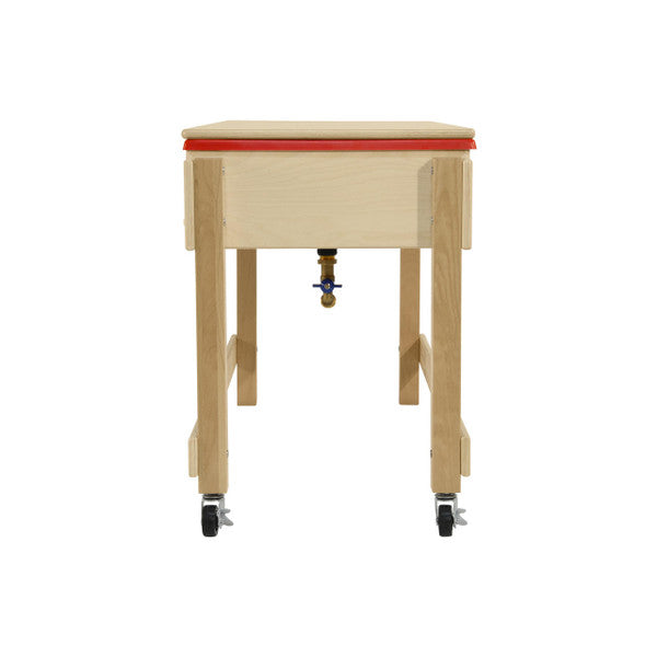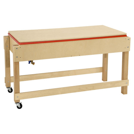 GREENGUARD Gold certified. Works great with rice, cereal, sand, water, and many other sensory materials. Rugged 6" deep plastic liner tray and drain faucet. Cover the tub with the provided lid and use this table as a work surface. The lid can also be placed underneath the tub to create a shelf that stores manipulatives. Constructed from Birch Plywood, and coated with our exclusive Tuff-Gloss™ UV finish. Fully rounded corners and edges for maximum safety. Casters on (2) legs for easy drainage. 24"H x 46"W x 17"D. Simple leg attachment required. Lifetime warranty. Made in the U.S.A.