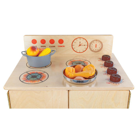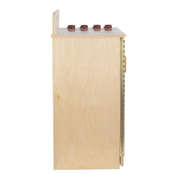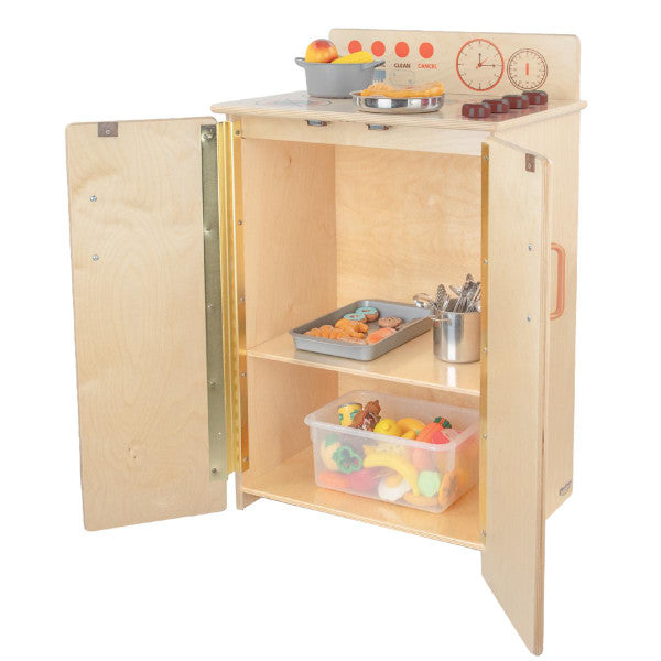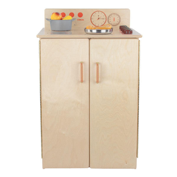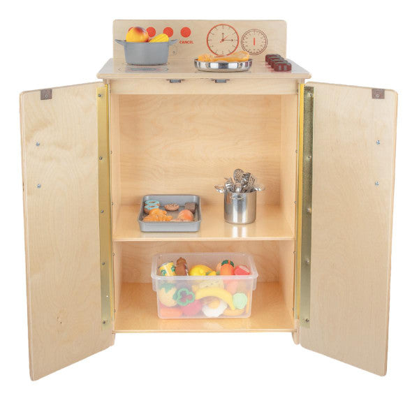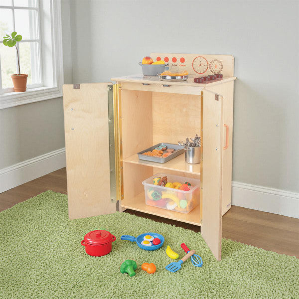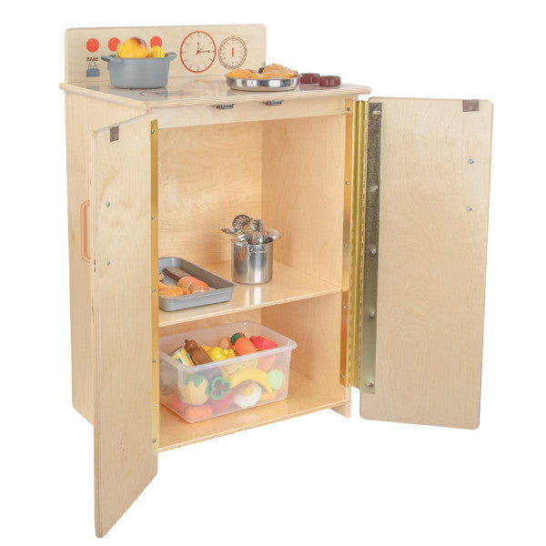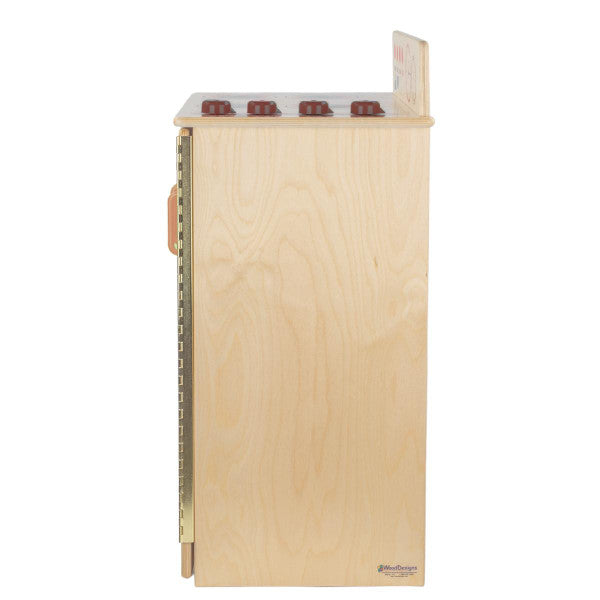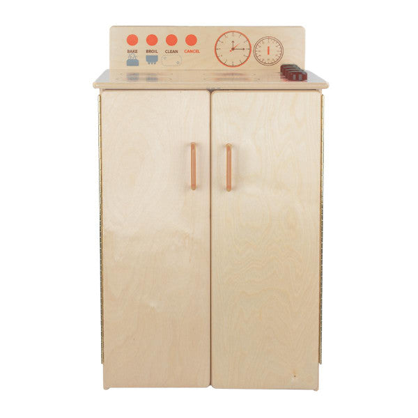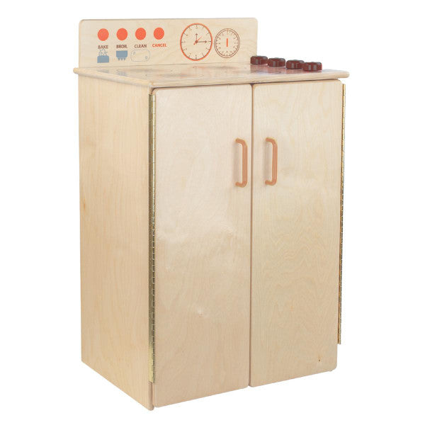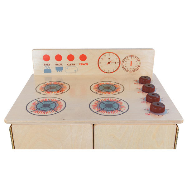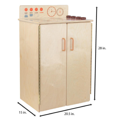 GREENGUARD Gold certified. Range includes fun play graphics and movable knobs that mimic a real kitchen. Constructed from Birch Plywood, and coated with our exclusive Tuff-Gloss™ UV finish. A recessed back for added strength, stability, and beauty. Full length Pinch-Me-Not™™ hinges with full length Tip-Me-Not™ doors. Fully rounded corners, edges, and doors for maximum safety. 28"H x 20-1/2"W x 15"D. Fully assembled. Lifetime warranty. Made in the U.S.A.