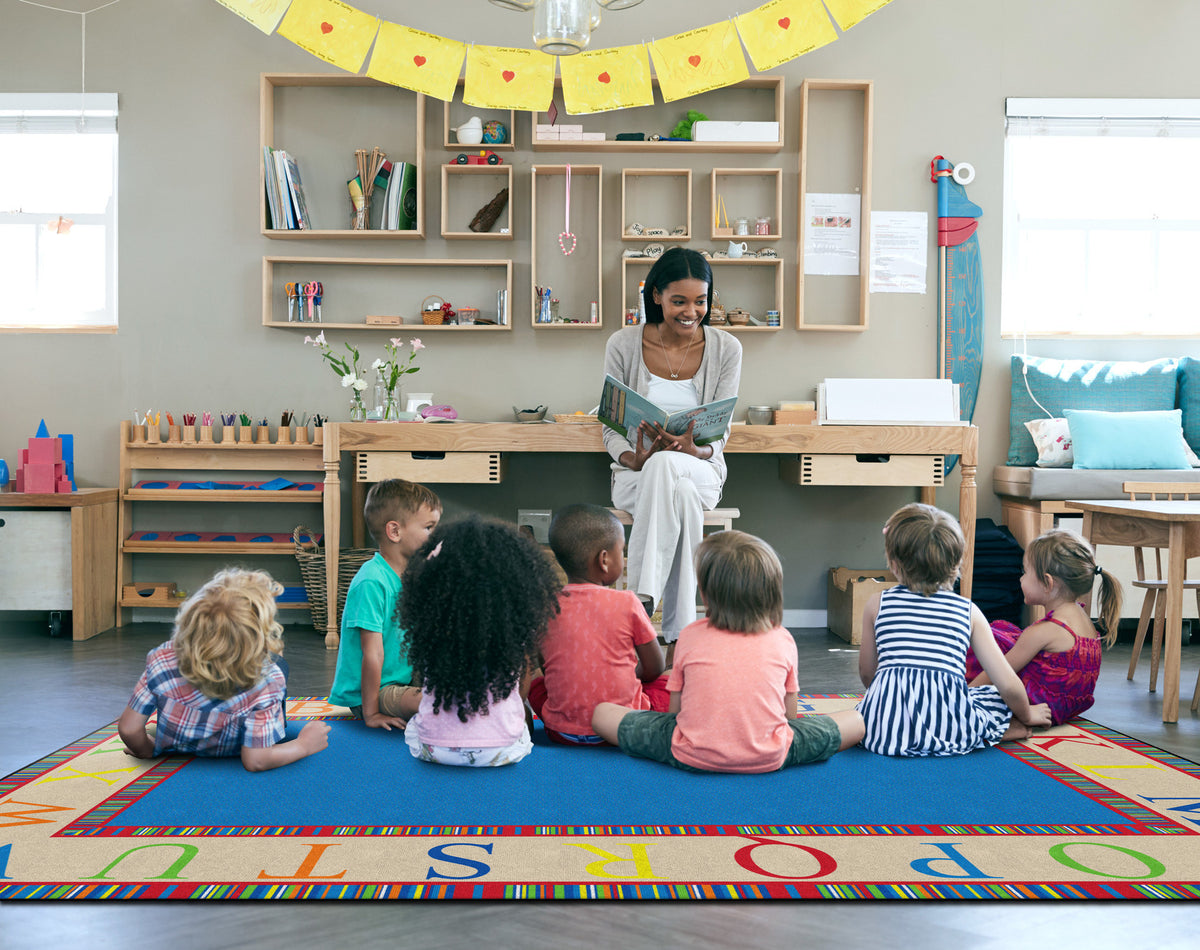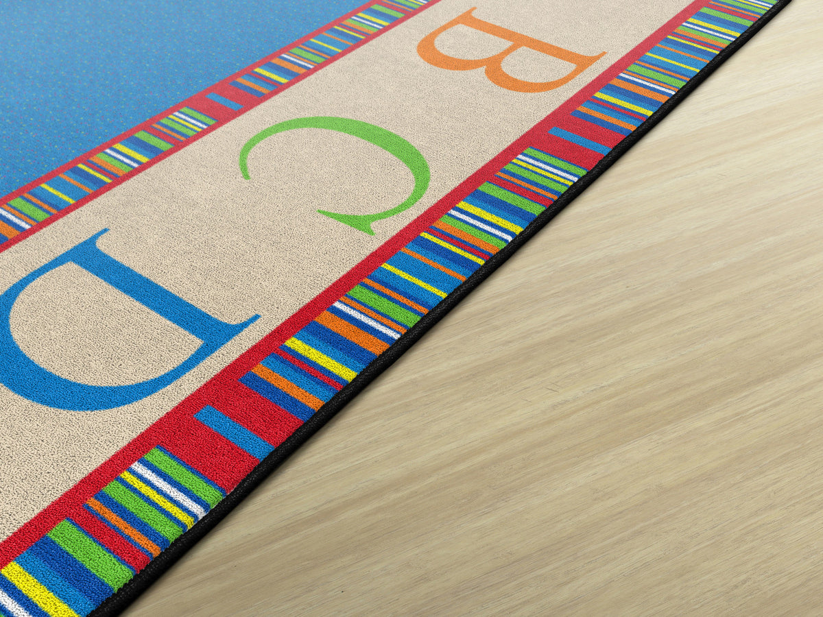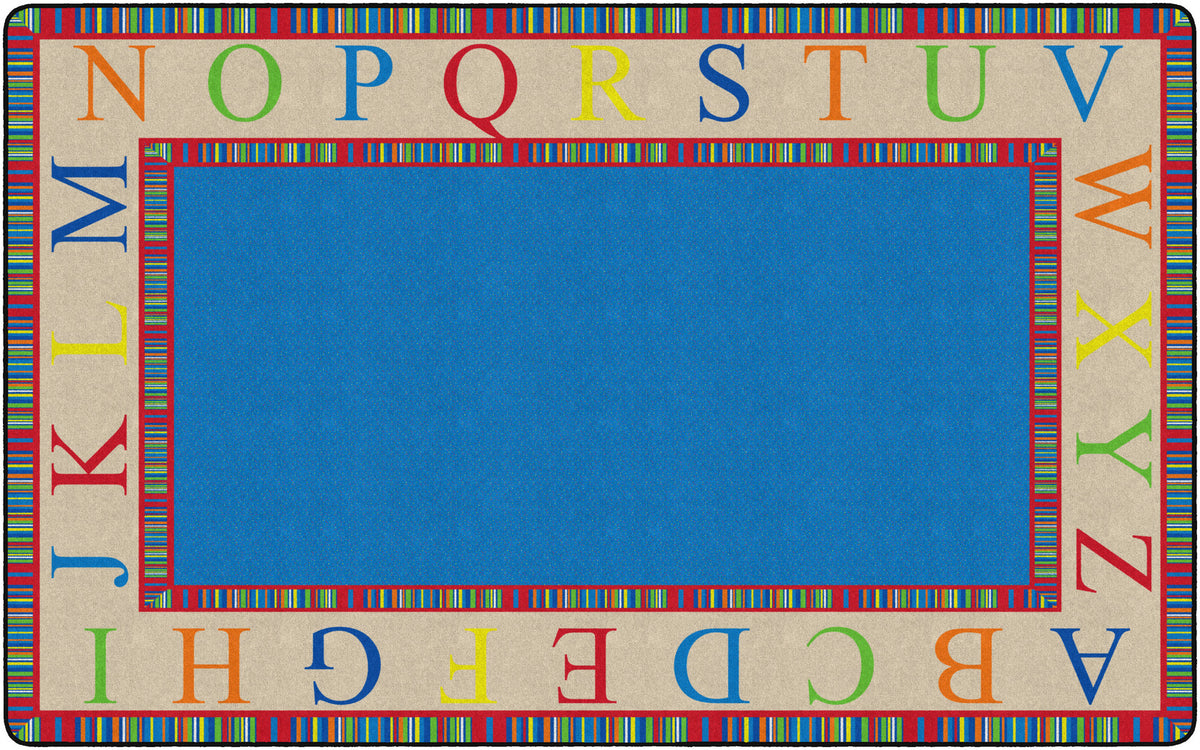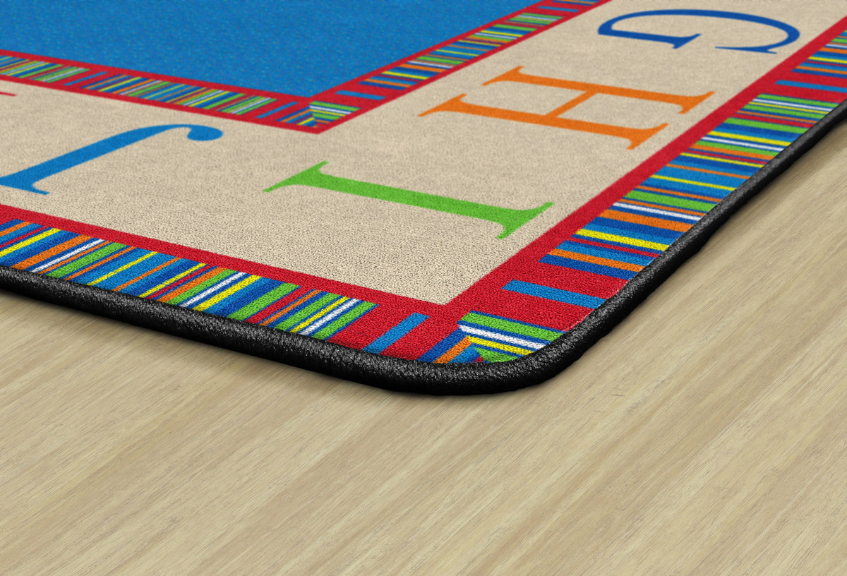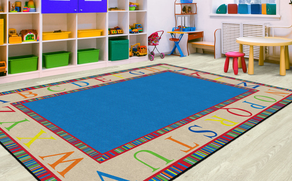 This rug features a colorful border of the alphabet in capital letters. This is a great accessory to any daycare, preschool, or classroom!