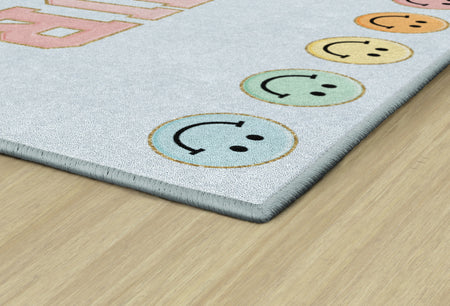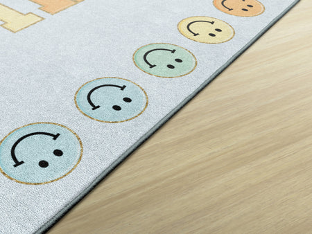 The pastel palette of this rug is perfect, and paired with the sweet phrase on a sky blue background, makes it a darling addition to any room!