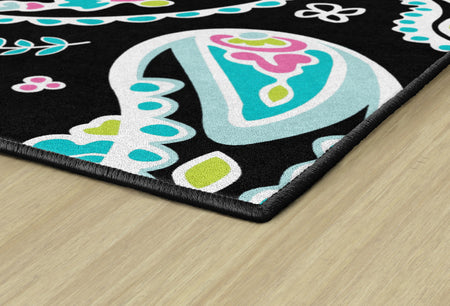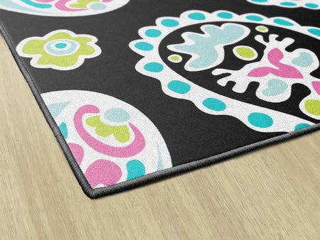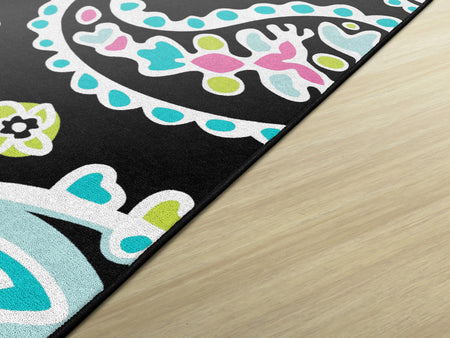 The timeless paisley pattern in shades of teals, pink, and green, on a background of midnight black, make this rug one of pure sophistication. This showstopper of a rug is simply eye-catching, and sure to be the centerpiece of decor within the classroom.
