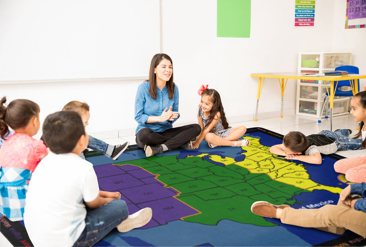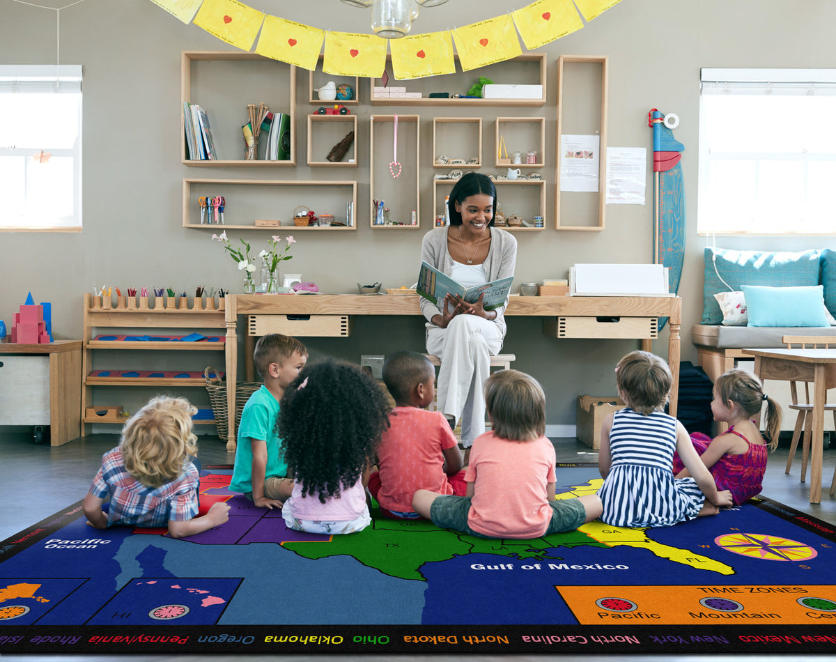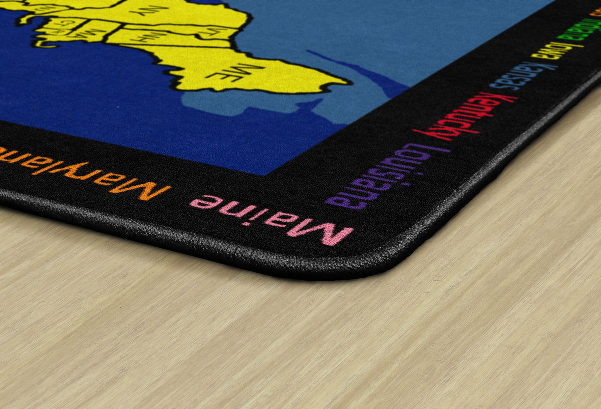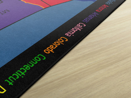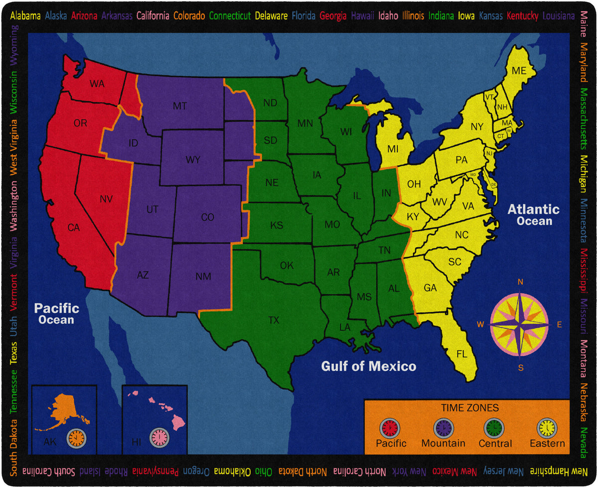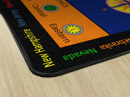 Time Zone helps children gain an understanding of the different time zones in the United States. The state names appear around the edges of the rug, offering the exercise of matching the names to the abbreviations on the map.