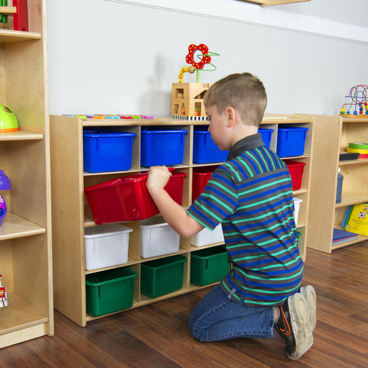 GREENGUARD Gold certified. Exclusive Tip-Me-Not™ construction makes this storage unit the safest you can buy. (20) assorted pastel trays will store all of your small manipulatives, toys, and supplies to keep them from getting misplaced. Constructed from Birch Plywood, and coated with our exclusive Tuff-Gloss™ UV finish. A recessed back for added strength, stability, and beauty. Fully rounded corners and edges for maximum safety. 30"H x 48"W x 15"D. Fully assembled on locking casters. Lifetime warranty. Made in the U.S.A.