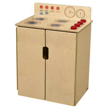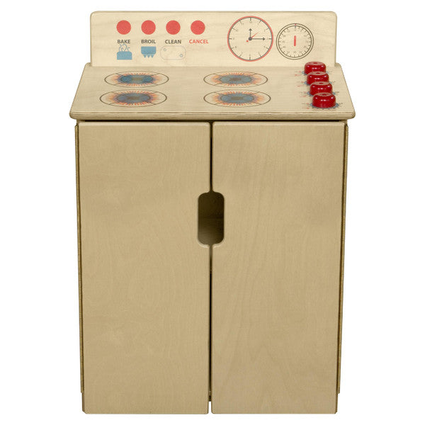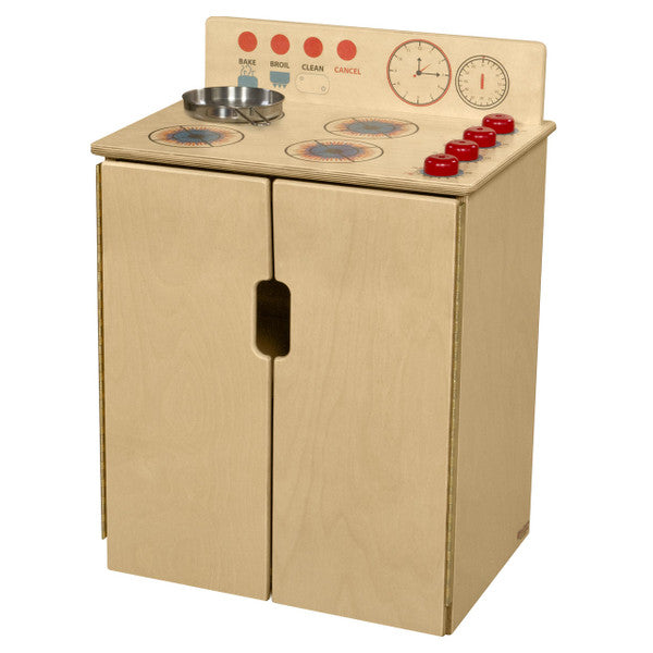 GREENGUARD Gold certified. Exclusive Tip-Me-Not™ construction makes this range the safest you can buy. Range includes fun play graphics and movable knobs that mimic a real kitchen. Constructed from Birch Plywood, and coated with our exclusive Tuff-Gloss™ UV finish. A recessed back for added strength, stability, and beauty. Full length Pinch-Me-Not™™ hinges with full length Tip-Me-Not™ doors. Fully rounded corners, edges, and doors for maximum safety. 22-9/16"H x 20-1/2"W x 15"D. Fully assembled. Lifetime warranty. Made in the U.S.A.
