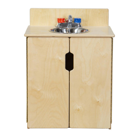 GREENGUARD Gold certified. Exclusive Tip-Me-Not™ construction makes this sink the safest you can buy. This sink combines an innovative new realistic silver faucet with movable plastic knobs, and a durable plastic sink pan. Constructed from Birch Plywood, and coated with our exclusive Tuff-Gloss™ UV finish. A recessed back for added strength, stability, and beauty. Full length Pinch-Me-Not™™ hinges with full length Tip-Me-Not™ doors. Fully rounded corners, edges, and doors for maximum safety. 22-9/16"H x 20-1/2"W x 15"D. Fully assembled. Lifetime warranty. Made in the U.S.A.