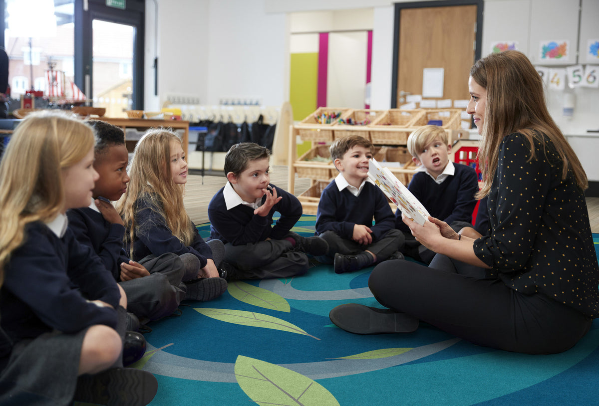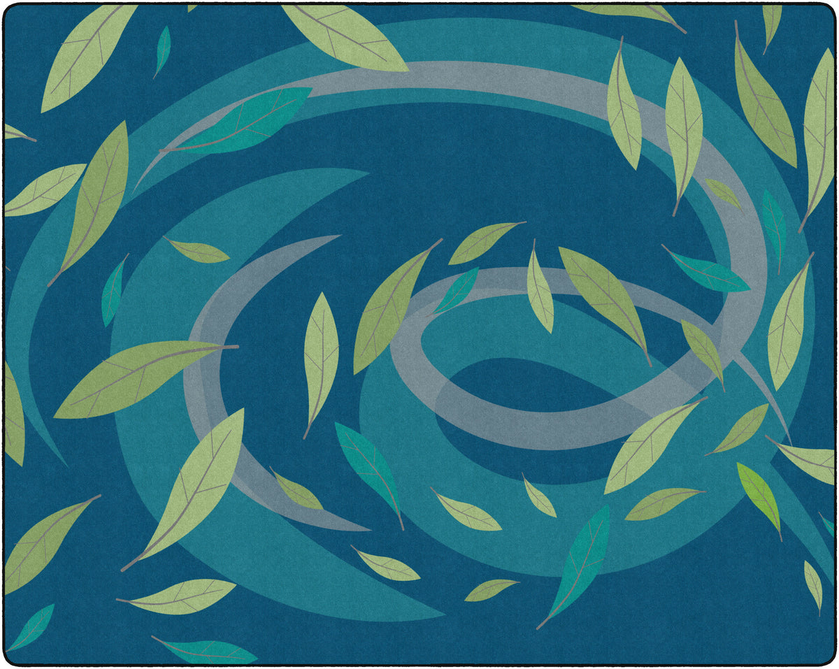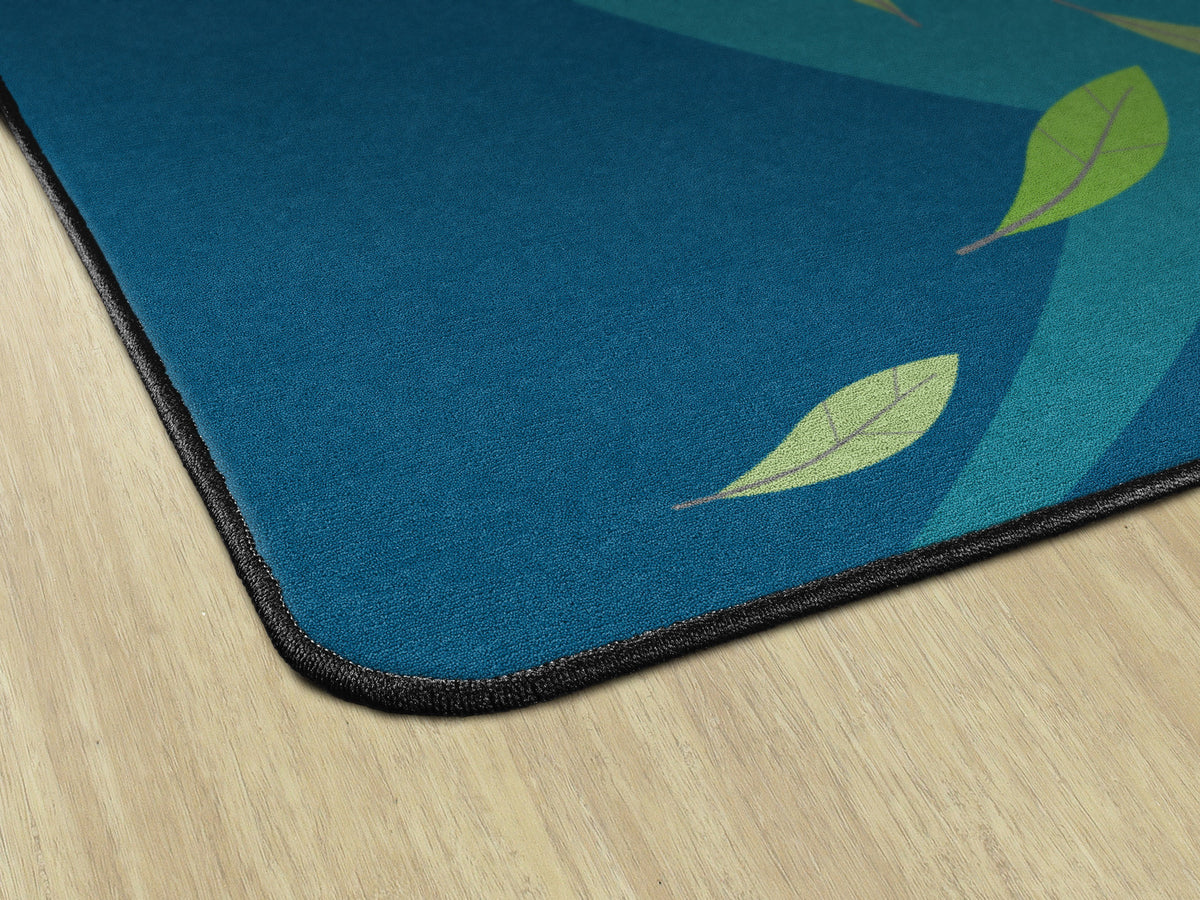 This rug features a calming, nature-inspired design with swirling blue and teal patterns accented by green leaves. The soothing colors create a peaceful atmosphere, perfect for early learners that benefit from a relaxing visual touch.