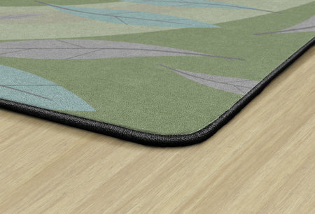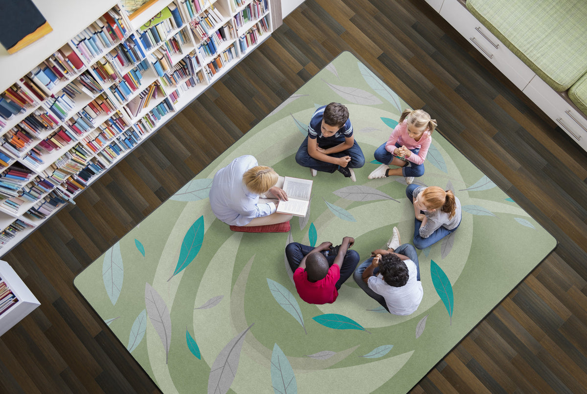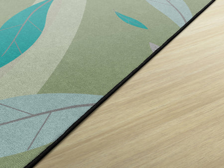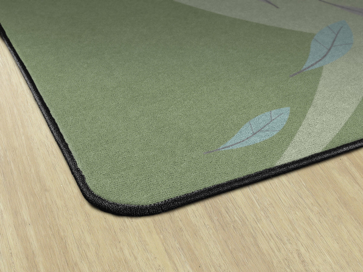 This rug features a gentle swirl of earthy green tones accented by soft blue and purple leaves drifting across a green background. Its calm, nature-inspired design brings a soothing atmosphere to the classroom, perfect for early learners.